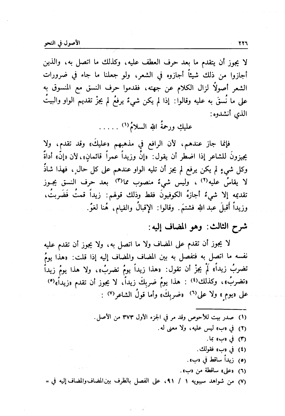 لا يجوز أن تقدم على المضاف ولا ما اتصل به، ولا يجوز أن تقدم عليه نفسه ما اتصل به فتفصل به بين المضاف والمضاف إليه إذا قلت: "هذا يومُ تضربُ زيدًا" لَمْ يجزْ أن تقول: "هذا زيدًا يومُ تضربُ"، ولا هذا يومُ زيدًا "تضربُ", وكذلك1: هذا يومُ ضربِكَ زيدًا، لا يجوز أن تقدم "زيدًا"2 على "يومٍ" ولا على3 "ضربِكَ" وأما قولُ الشاعر4: