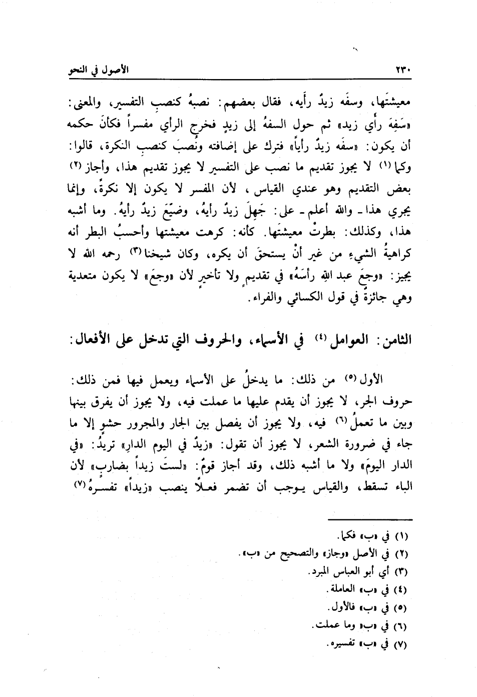 الأول 2 من ذلك: ما يدخلُ على الأسماء ويعمل فيها, فمن ذلك: حروف الجر، لا يجوز أن يقدم عليها ما عملت فيه، ولا يجوز أن يفرق بينها وبين ما تعملُ3 فيه، ولا يجوز أن يفصل بين الجار والمجرور حشو إلا ما جاء في ضرورة الشعر، لا يجوز أن تقول: "زيدٌ في اليوم الدارِ" تريدُ: "في الدار اليومَ" ولا ما أشبه ذلك، وقد أجاز قومٌ: "لستَ زيدًا بضاربٍ" لأن الباء تسقط، والقياس يوجب أن تضمر فعلًا ينصب "زيدًا" تفسرهُ4