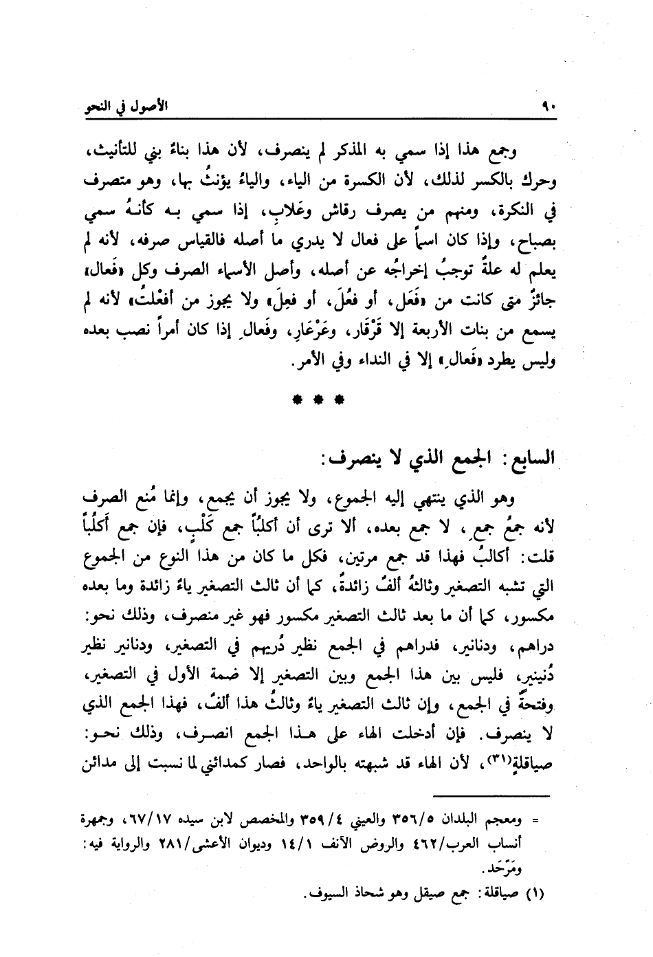 وهو الذي ينتهي إليه الجموع، ولا يجوز أن يجمع، وإنما مُنع الصرف لأنه جمعُ جمع، لا جمع بعده، ألا ترى أن أكلُبًا جمع كَلْبٍ، فإن جمع أَكلُبًا قلت: أكالبُ فهذا قد جمع مرتين، فكل ما كان من هذا النوع من الجموع التي تشبه التصغير وثالثهُ ألفٌ زائدةٌ، كما أن ثالث التصغير ياءٌ زائدة وما بعده مكسور، كما أن ما بعد ثالث التصغير مكسور فهو غير منصرف، وذلك نحو: دراهم ودنانير, فدراهم في الجمع نظير دُريهم في التصغير، ودنانير نظير دُنينير, فليس بين هذا الجمع وبين التصغير إلا ضمة الأول في التصغير, وفتحة في الجمع, وإن ثالث التصغير ياءٌ وثالث هذا ألفٌ, فهذا الجمع الذي لا ينصرف. فإن أدخلت الهاء على هذا الجمع انصرف، وذلك نحو صياقلةٍ1؛ لأن الهاء قد شبهته بالواحد، فصار كمدائني لما نسبت إلى مدائن