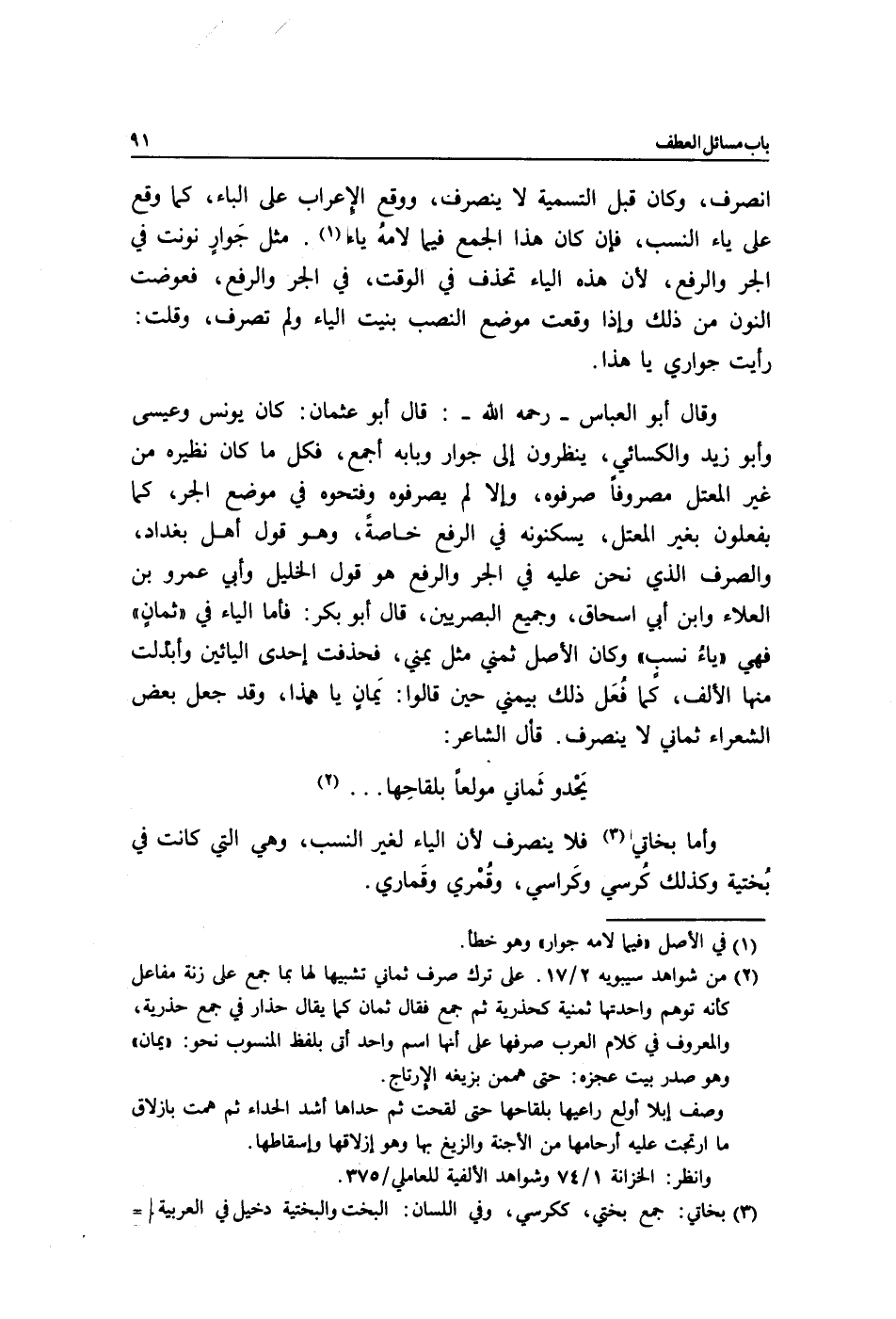 وقال أبو العباس, رحمه الله: قال أبو عثمان: كان يونس وعيسى وأبو زيد والكسائي ينظرون إلى جوار وبابه أجمع، فكل ما كان نظيره من غير المعتل مصروفًا صرفوه, وإلا لم يصرفوه وفتحوه في موضع الجر, كما يفعلون بغير المعتل يسكنونه في الرفع خاصةً، وهو قول أهل بغداد، والصرف الذي نحن عليه في الجر والرفع هو قول الخليل وأبي عمرو بن العلاء وابن أبي إسحاق، وجميع البصريين، قال أبو بكر: فأما الياء في "ثمانٍ" فهي "ياءُ نسبٍ" وكان الأصل ثمني مثل يمني, فحذفت إحدى الياءين وأبدلت منها الألف, كما فُعل ذلك بيمني حين قالوا: يَمانٍ يا هذا, وقد جعل بعض الشعراء ثماني لا ينصرف. قال الشاعر: