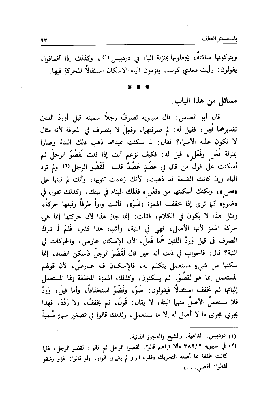 قال أبو العباس: قال سيبويه: تصرفُ رجلًا سميته قيل أوردَ اللتين تقديرهما فُعِل، فقيل له: لم صرفتهما, وفعِلَ لا ينصرف في المعرفة لأنه مثال لا تكون عليه الأسماء؟ فقال: لما سكنت عيناهما ذهب ذلك البناءُ وصارا بمنزلة فُعْلٍ وفَعْلٍ قيل له: فكيف تزعم أنك إذا قلت لَقضْوُ الرجلُ ثم أسكنت على قول من قال في عَضُدٍ: عَضْدٌ قلت: لَقَضْو الرجل1، ولم ترد الياء وإن كانت الضمة قد ذهبت؛ لأنك زعمت تنويها, وأنك لم تبنها على "فعلٍ" ولكنك أسكنتها من "فَعْلٍ" فذلك البناء في نيتك, وكذلك تقول في "ضوءٍ" كما ترى إذا خففت الهمزة "ضَوٌ" فأثبت واوًا طرفًا وقبلها حركةٌ, ومثل هذا لا يكون في الكلام، فقلت: إنما جاز هذا لأن حركتها إنما هي حركة الهمز لأنها الأصل، فهي في النية وأشباه هذا كثير فَلمَ لَم تترك الصرف في قيل وَردَّ اللتين هُما فَعلَ؛ لأن الإِسكان عارض، والحركات في النية؟ قال: فالجواب في ذلك أنه حين قال: لَقَضْوَ الرجلُ فأسكن الضاد, إنما سكنها من شيءٍ مستعمل يتكلم به, فالإِسكان فيه عارضٌ؛ لأن قولهم المستعمل إنما هو لَقَضُوَ ثم يسكنون, وكذلك الهمزة المخففة إنما المستعمل إثباتها ثم تخفف استثقالًا فيقولون: ضَوٌ وقَضْو استخفافًا، وأما قيلَ، وَردَّ فلا يستعملُ الأصلُ منهما ألبتة، لا يقال: قَول ثم يخففُ ولا رَدُدَ, فهذا يجري مجرى ما لا أصل له إلا ما يستعمل، ولذلك قالوا في تصغير سماءٍ: سُمَيةٌ