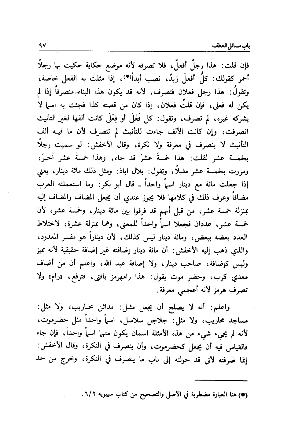 فإن قلت: هذا رجل أفعل، فلا تصرفه لأنه موضع حكاية حكيت بها رجلًا أحمر كقولك: كلُّ أفعلَ زيدٌ، نصب أبدًا*، إذا مثلت به الفعل خاصة، وتقولُ: هذا رجل فعلان فتصرف؛ لأنه قد يكون هذا البناء منصرفًا إذا لم يكن له فعلى, فإن قلتُ فعلان إذا كان من قصته كذا فجئت به اسما لا يشركه غيره, لم تصرف وتقول: كل فَعْلَى أو فِعْلَى كانت ألفها لغير التأنيث انصرفت, وإن كانت الألف جاءت للتأنيث لم تنصرف لأن ما فيه ألف التأنيث لا ينصرف في معرفة ولا نكرة، وقال الأخفش: لو سميت رجلًا بخمسة عشر لقلت: هذا خمسةَ عشرَ قد جاء، وهذا خمسةَ عشر آخرَ, ومررت بخمسة عشر مقبلًا، وتقول: بلال أباذ. ومثل ذلك مائة دينار يعني إذا جعلت مائة مع دينار اسمًا واحدًا, قال أبو بكر: وما استعملته العرب مضافًا وعرف ذلك في كلامها فلا يجوز عندي أن يجعل المضاف والمضاف إليه بمنزلة خمسة عشر, من قبل أنهم قد فرقوا بين مائة دينار وخمسة عشر؛ لأن خمسة عشر, عددان فجعلا اسمًا واحدًا للمعنى وهما بمنزلة عشرة؛ لاختلاط العدد بعضه ببعض, ومائة دينار ليس كذلك؛ لأن دينارًا هو مفسر المعدود، والذي ذهب إليه الأخفش: أن مائة دينار إضافته غير إضافة حقيقية لأنه مميز وليس كإضافة صاحب دينار، ولا إضافة عبد الله, واعلم أن من أضاف معدي كرب وحضر موت يقول: هذا رامهرمز يا فتى فترفع "رام" ولا تصرف هرمز؛ لأنه أعجمي معرفة.