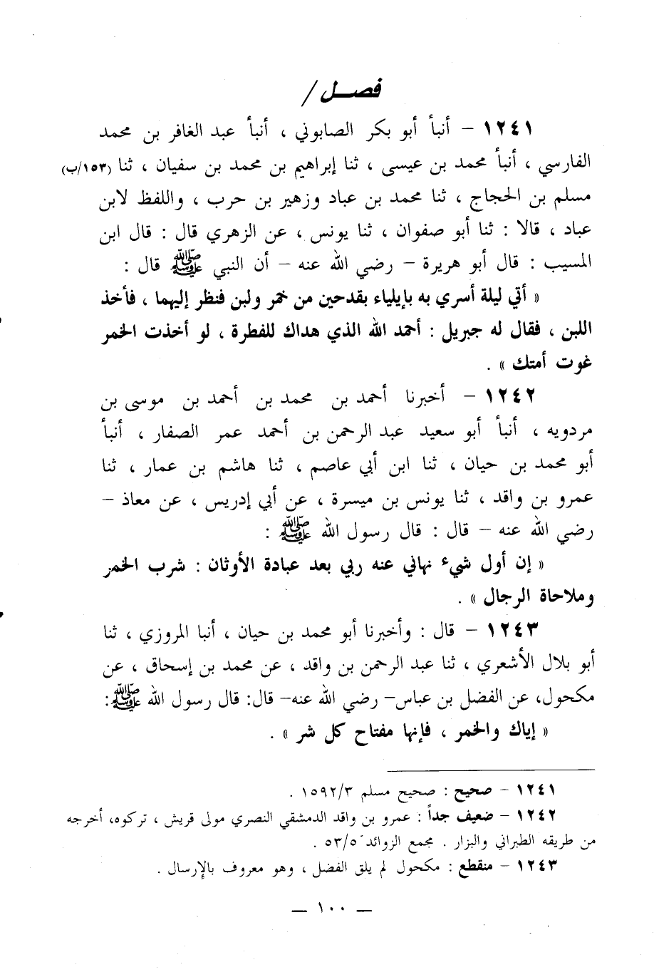 1241- أنبأ أبو بكر الصابوني، أنبأ عبد الغافر بن محمد الفارسي، أنبأ محمد بن عيسى، ثنا إبراهيم بن محمد بن سفيان، ثنا مسلم بن الحجاج، ثنا محمد بن عباد وزهير بن حرب، واللفظ لابن عباد، قالا: ثنا أبو صفوان، ثنا يونس، عن الزهري قال: قال ابن المسيب: قال أبو هريرة –رضي الله عنه- أن النبي صلى الله عليه وسلم قال: