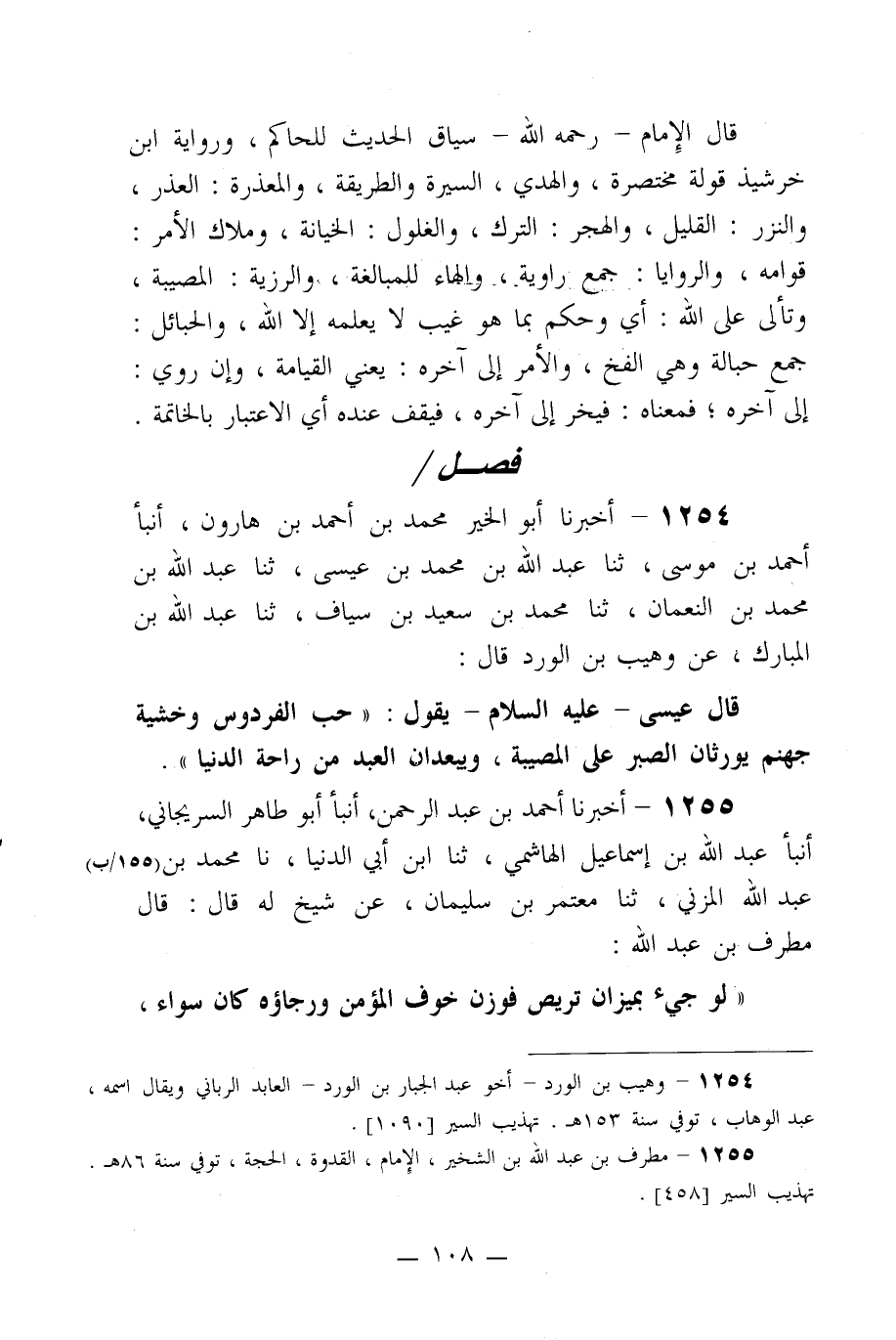 1254- أخبرنا أبو الخير محمد بن أحمد بن هارون، أنبأ أحمد بن موسى، ثنا عبد الله بن محمد بن عيسى، ثنا عبد الله بن محمد بن النعمان، ثنا محمد بن سعيد بن سياف، ثنا عبد الله بن المبارك، عن وهيب بن الورد قال: