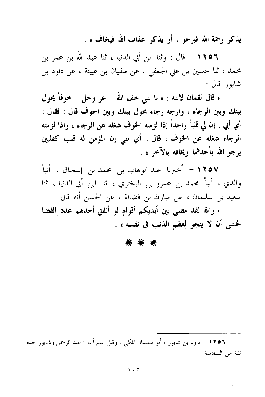 1256- قال: وثنا ابن أبي الدنيا، ثنا عبد الله بن عمر بن محمد، ثنا حسين بن علي الجعفي، عن سفيان بن عيينة، عن داود بن شابور، قال: