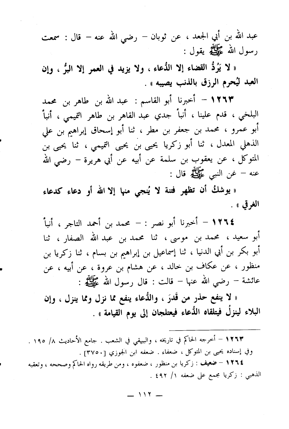 1264- أخبرنا أبو نصر: - محمد بن أحمد التاجر، أنبأ أبو سعيد، محمد بن موسى، ثنا محمد بن عبد الله الصفار، ثنا أبو بكر بن أبي الدنيا، ثنا إسماعيل بن إبراهيم بن بسام، ثنا زكريا بن منظور، عن عكاف بن خالد، عن هشام بن عروة، عن أبيه، عن عائشة –رضي الله عنها- قالت: قال رسول الله صلى الله عليه وسلم: