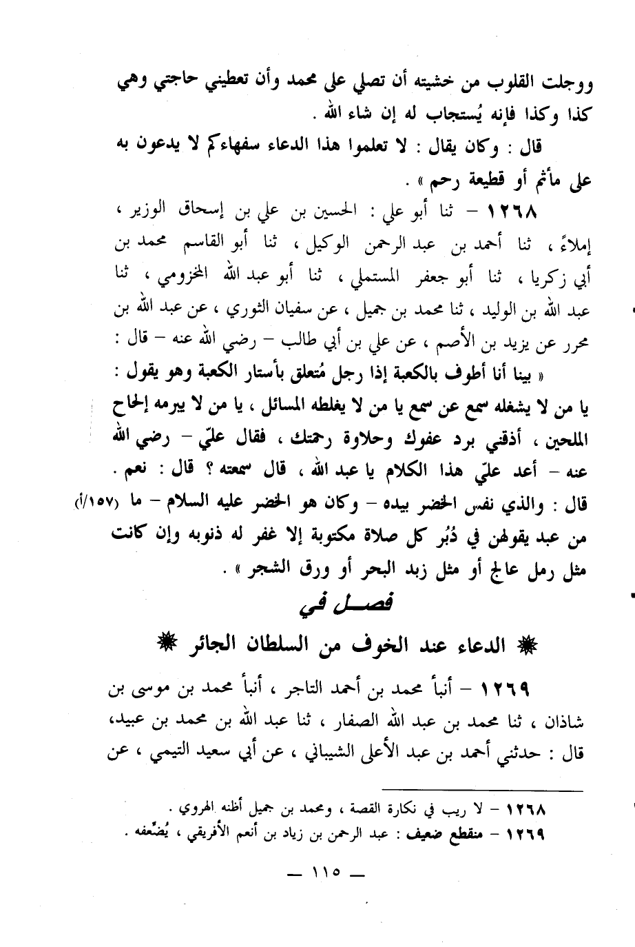 1268- ثنا أبو علي: الحسين بن علي بن إسحاق الوزير، إملاءً، ثنا أحمد بن عبد الرحمن الوكيل، ثنا أبو القاسم محمد بن أبي زكريا، ثنا أبو جعفر المستملي، ثنا أبو عبد الله المخزومي، ثنا عبد الله بن الوليد، ثنا محمد بن جميل، عن سفيان الثوري، عن عبد الله بن محرر عن يزيد بن الأصم، عن علي بن أبي طالب –رضي الله عنه- قال: