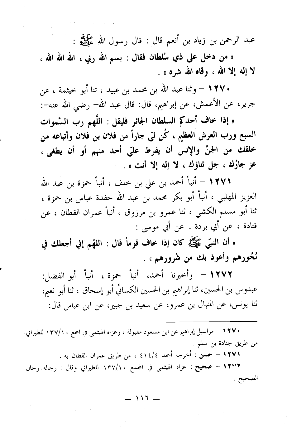 -[117]- ((إذا أتيت سلطاناً مهيباً تخاف سطوته فقل: الله أكبر، الله أعز من خلقه جميعاً، الله أعز مما أخاف وأحذر. أعوذ بالله الذي لا إله إلا هو الممسك السموات أن يقعن على الأرض إلا بإذنه من شر عبدك فلان وجنوده وأتباعه وأشياعه من الجن والإنس، اللهم كن لي جاراً من شرهم، جل ثناؤك وعز جارك. تبارك اسمك، ولا إله غيرك، ثلاث مرات)) .