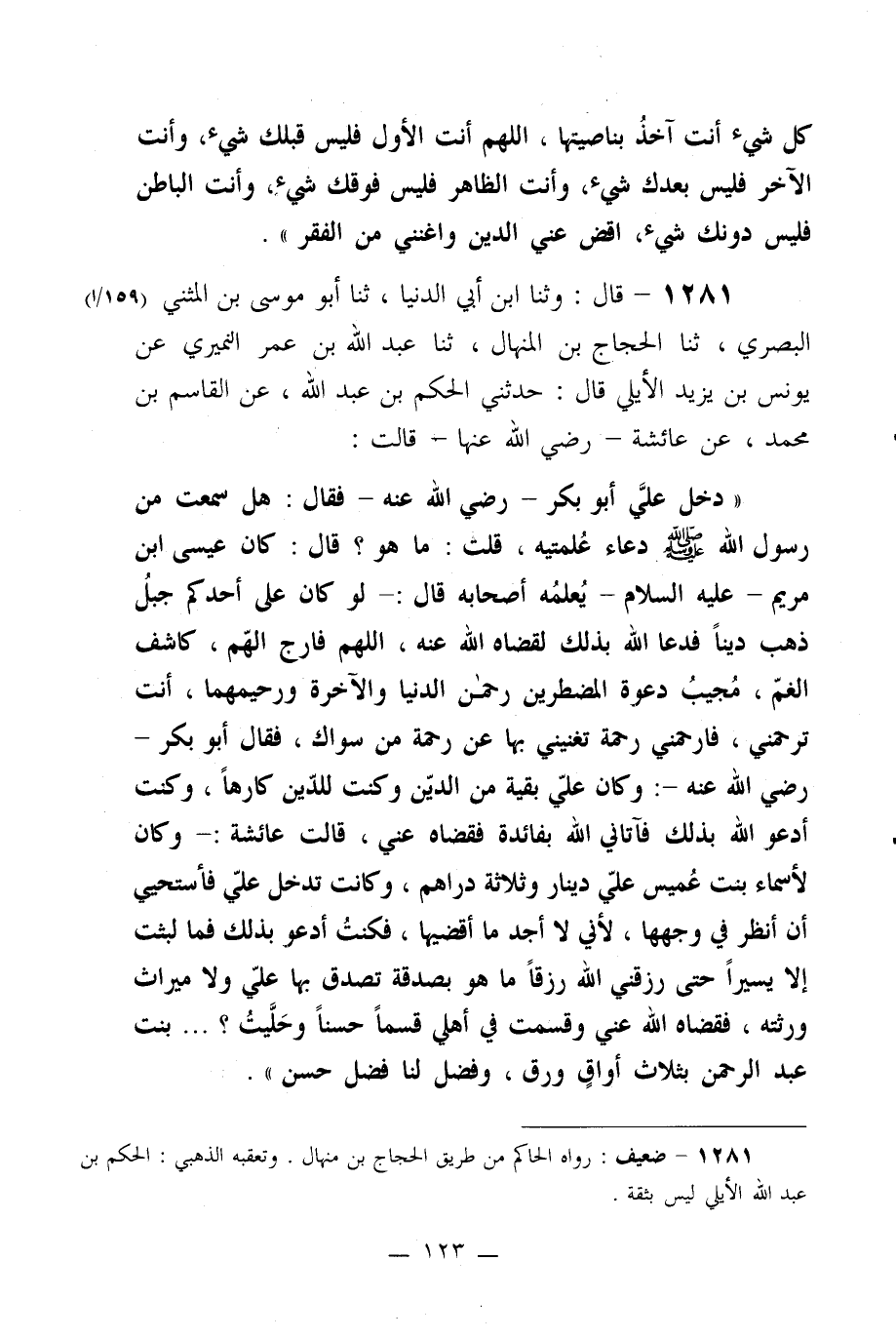 1281- قال: وثنا ابن أبي الدنيا، ثنا أبو موسى بن المثنى البصري، ثنا الحجاج بن المنهال، ثنا عبد الله بن عمر النميري عن يونس بن يزيد الأيلي قال: حدثني الحكم بن عبد الله، عن القاسم بن محمد، عن عائشة –رضي الله عنه- قالت: