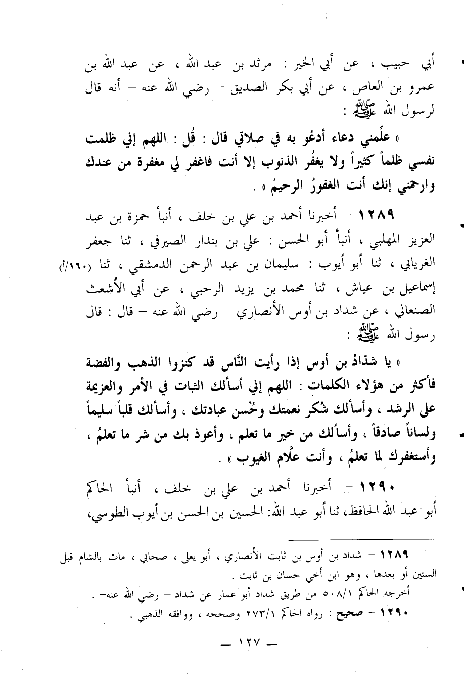 1289- أخبرنا أحمد بن علي بن خلف، أنبأ حمزة بن عبد العزيز المهلبي، أنبأ أبو الحسن: علي بن بندار الصيرفي، ثنا جعفر الغريابي، ثنا أبو أيوب: سليمان بن عبد الرحمن الدمشقي، ثنا إسماعيل بن عياش، ثنا محمد بن يزيد الرحبي، عن أبي الأشعث الصنعاني، عن شداد بن أوس الأنصاري –رضي الله عنه- قال: قال رسول الله صلى الله عليه وسلم: