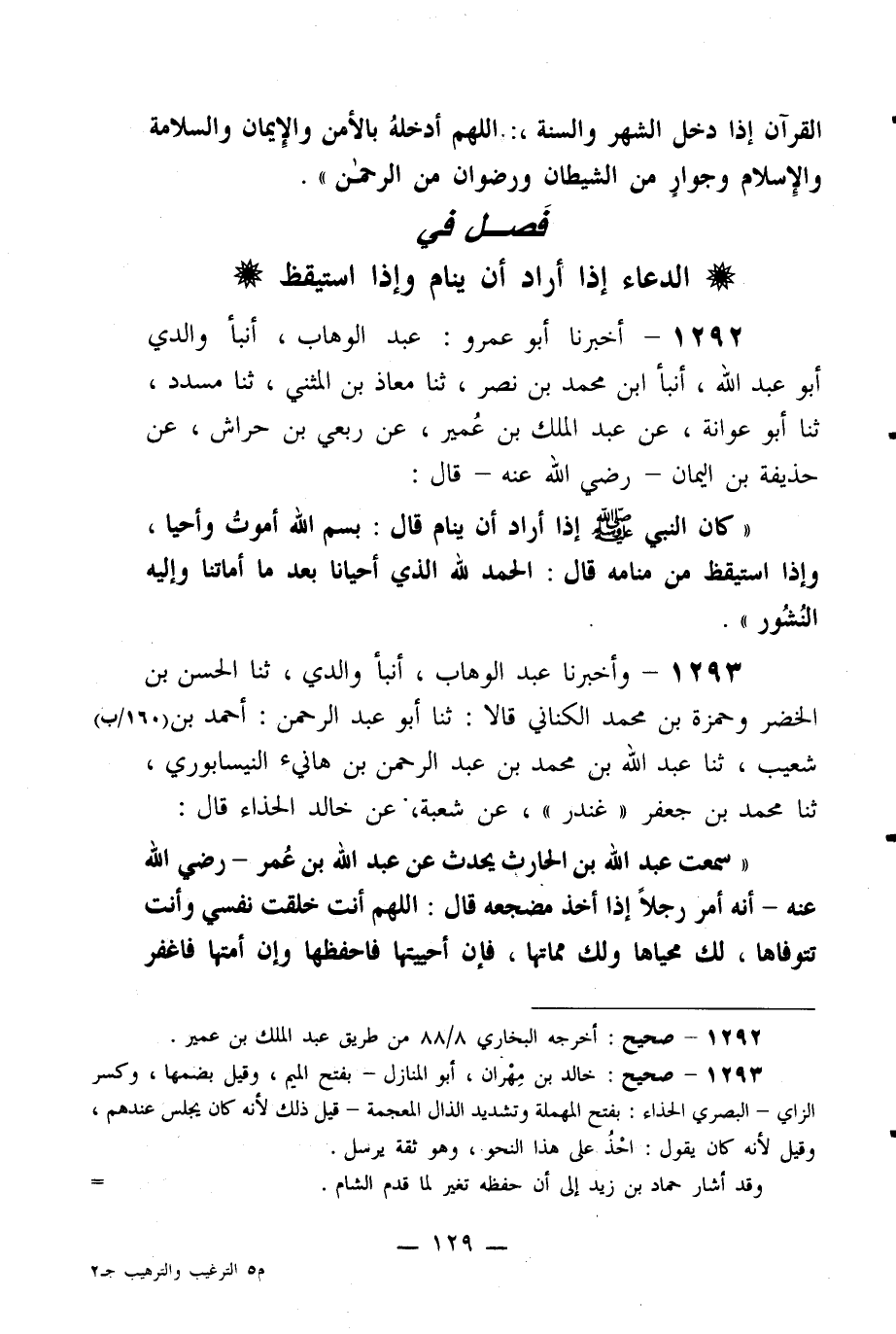 1292- أخبرنا أبو عمرو: عبد الوهاب، أنبأ والدي أبو عبد الله، أنبأ ابن محمد بن نصر، ثنا معاذ بن المثنى، ثنا مسدد، ثنا أبو عوانة، عن عبد الملك بن عمير، عن ربعي بن حراش، عن حذيفة بن اليمان –رضي الله عنه- قال: