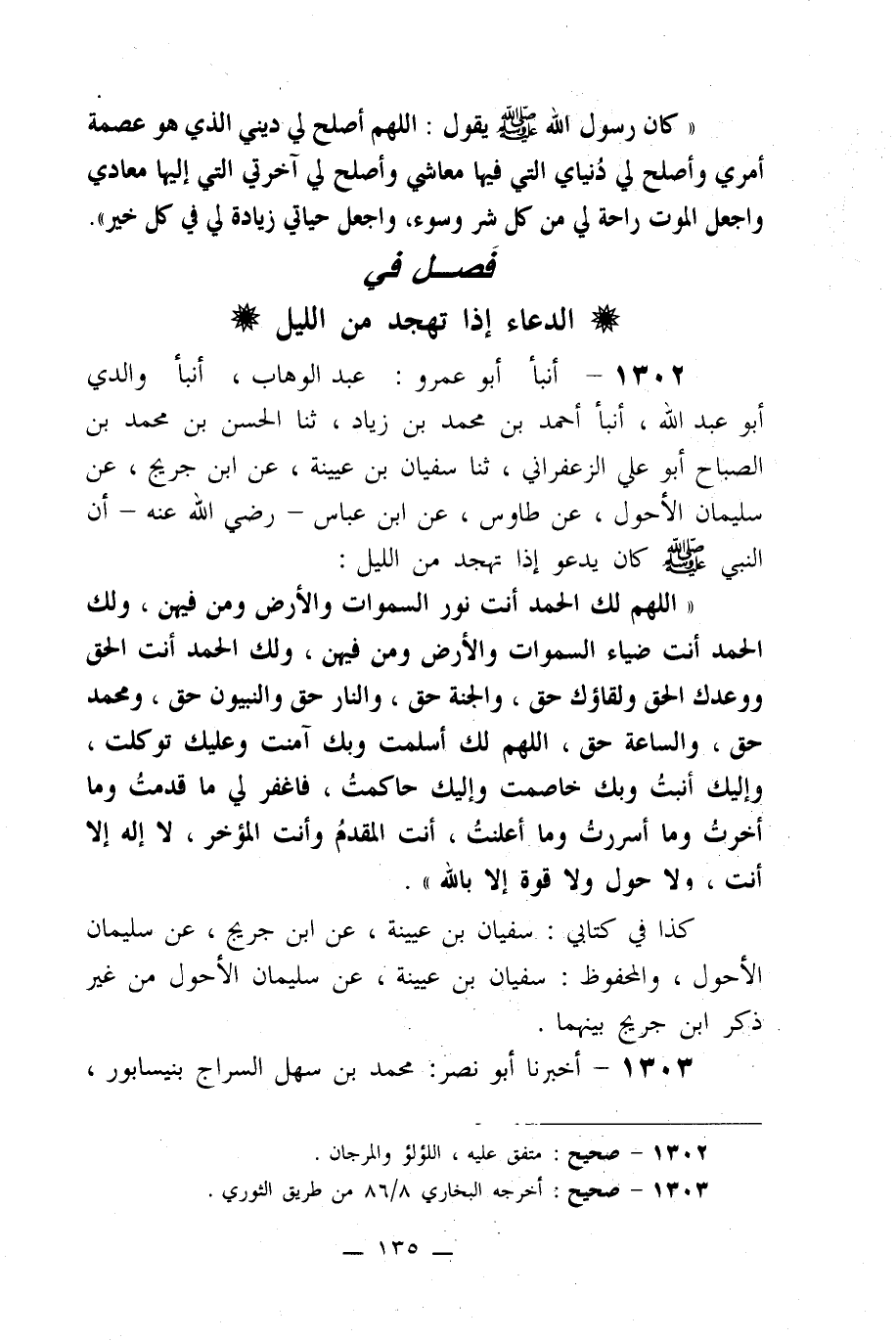 1302- أنبأ أبو عمرو: عبد الوهاب، أنبأ والدي أبو عبد الله، أنبأ أحمد بن محمد بن زياد، ثنا الحسن بن محمد بن الصباح أبو علي الزعفراني، ثنا سفيان بن عيينة، عن ابن جريج، عن سليمان الأحول، عن طاوس، عن ابن عباس –رضي الله عنه- أن النبي صلى الله عليه وسلم كان يدعو إذا تهجد من الليل: