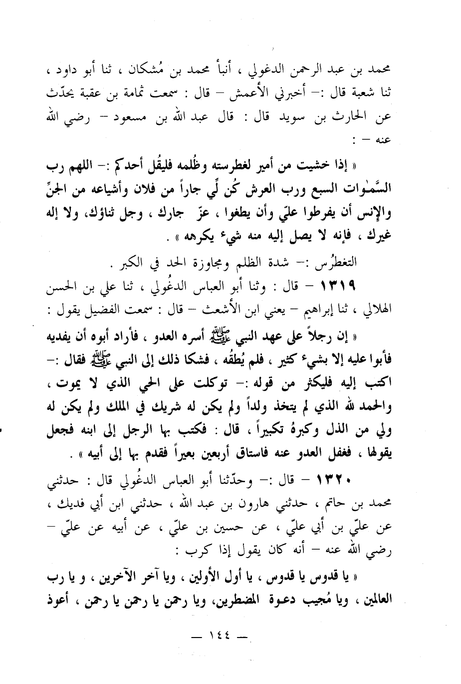 1320- قال: وحدثنا أبو العباس الدغولي قال: حدثني محمد بن حاتم، حدثني هارون بن عبد الله، حدثني ابن أبي فديك، عن علي بن أبي علي، عن حسين بن علي، عن أبيه عن علي –رضي الله عنه- أنه كان يقول إذا كرب: