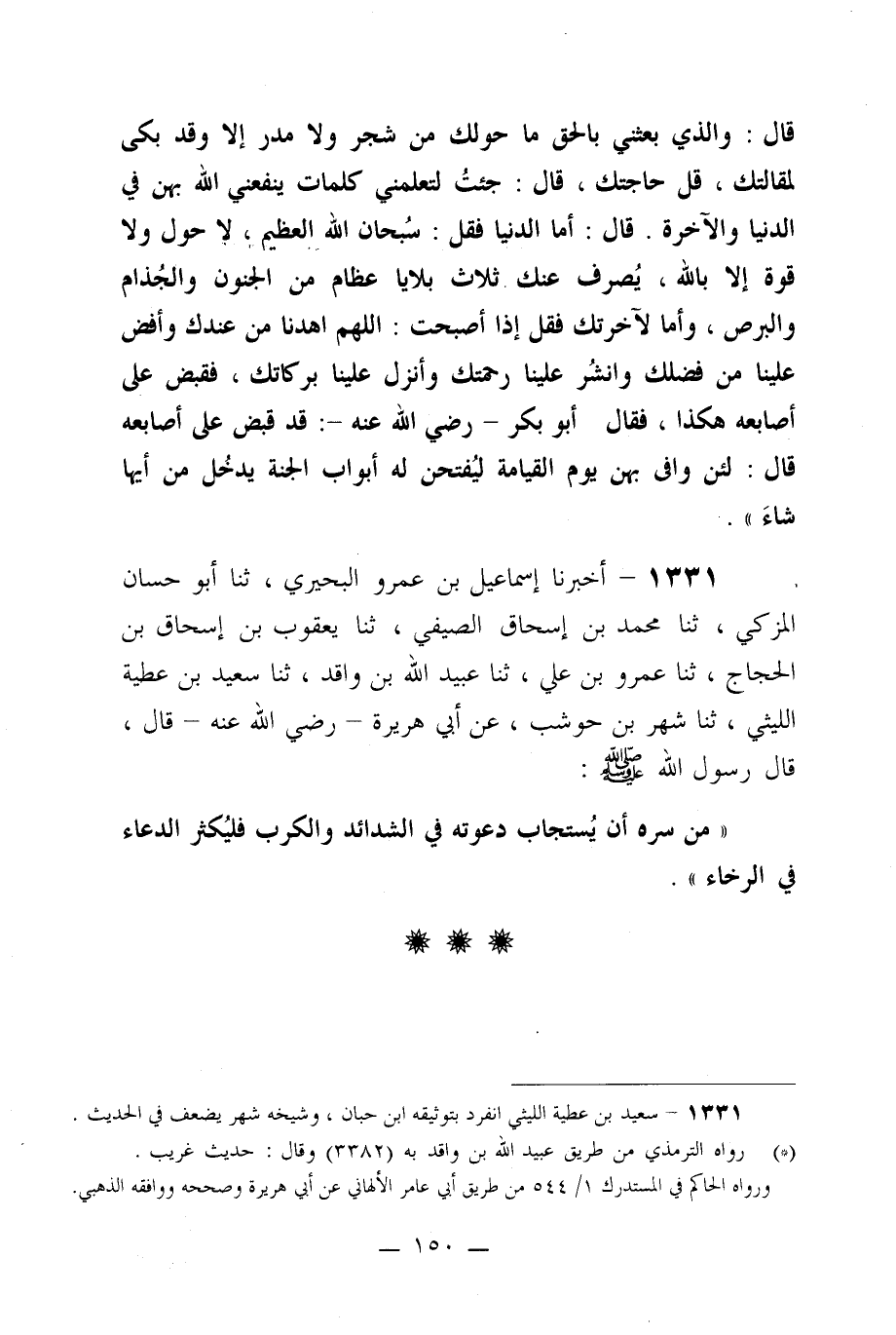 1331- أخبرنا إسماعيل بن عمرو البحيري، ثنا أبو حسان المزكي، ثنا محمد بن إسحاق الصيفي، ثنا يعقوب بن إسحاق بن الحجاج، ثنا عمرو بن علي، ثنا عبيد الله بن واقد، ثنا سعيد بن عطية الليثي، ثنا شهر بن حوشب، عن أبي هريرة –رضي الله عنه- قال، قال رسول الله صلى الله عليه وسلم: