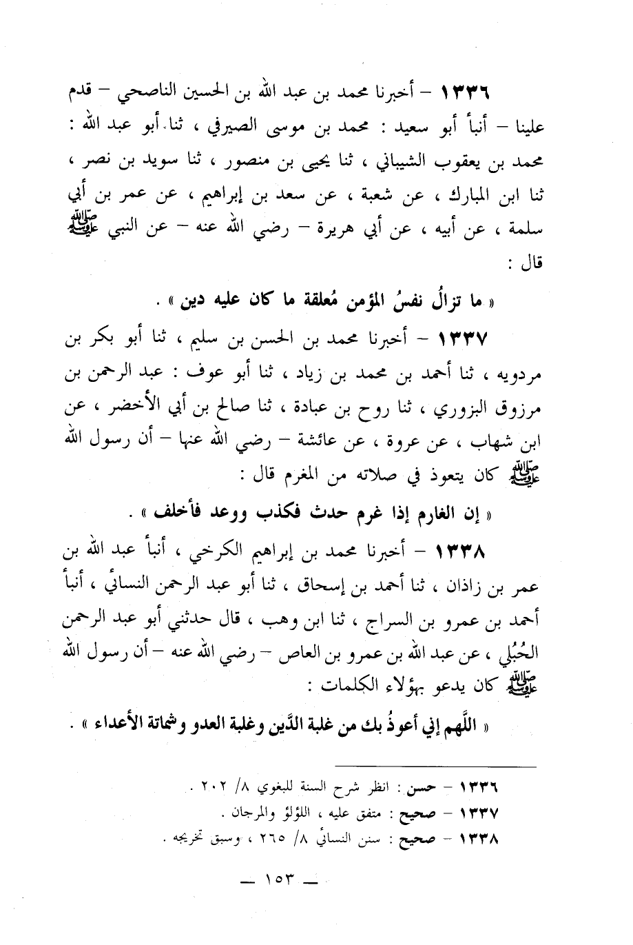 1338- أخبرنا محمد بن إبراهيم الكرخي، أنبأ عبد الله بن عمر بن زاذان، ثنا أحمد بن إسحاق، ثنا أبو عبد الرحمن النسائي، أنبأ أحمد بن عمرو بن السراج، ثنا ابن وهب، قال حدثني أبو عبد الرحمن الحبلي، عن عبد الله بن عمرو بن العاص –رضي الله عنه- أن رسول الله صلى الله عليه وسلم كان يدعو بهؤلاء الكلمات: