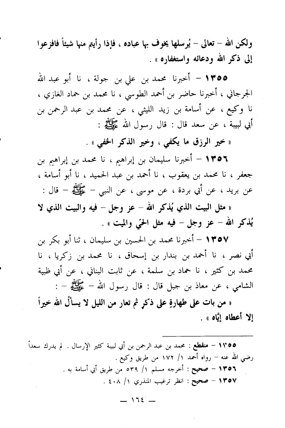 1355- أخبرنا محمد بن علي بن جولة، نا أبو عبد الله الجرجاني، أخبرنا حاضر بن أحمد الطوسي، نا محمد بن حماد الغازي، نا وكيع، عن أسامة بن زيد الليثي، عن محمد بن عبد الرحمن بن أبي لبيبة، عن سعد قال: قال رسول الله صلى الله عليه وسلم: