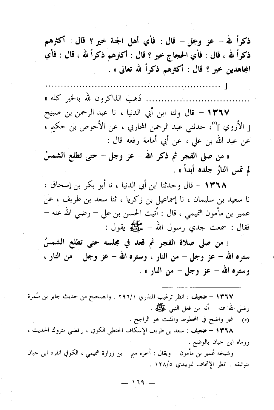 1368- قال وحدثنا ابن أبي الدنيا، نا أبو بكر بن إسحاق، نا سعيد بن سليمان، نا إسماعيل بن زكريا، ثنا سعد بن طريف، عن عمير بن مأمون التميمي، قال: أتيت الحسن بن علي –رضي الله عنه- فقال: سمعت جدي رسول الله صلى الله عليه وسلم يقول: