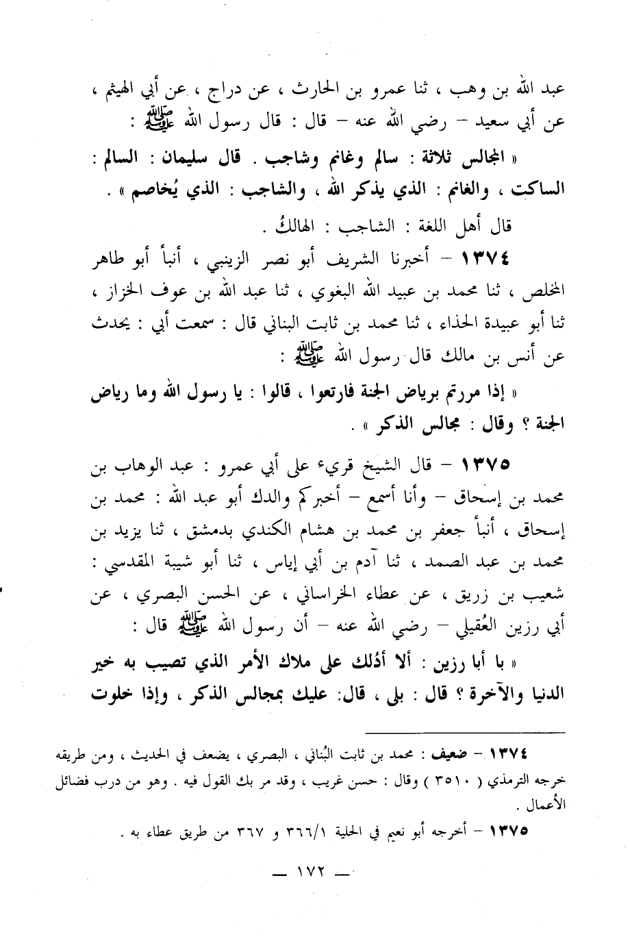 1374- أخبرنا الشريف أبو نصر الزينبي، أنبأ أبو طاهر المخلص، ثنا محمد بن عبيد الله البغوي، ثنا عبد الله بن عوف الخزاز، ثنا أبو عبيدة الحذاء، ثنا محمد بن ثابت البناني قال: سمعت أبي: يحدث عن أنس بن مالك قال رسول الله صلى الله عليه وسلم: