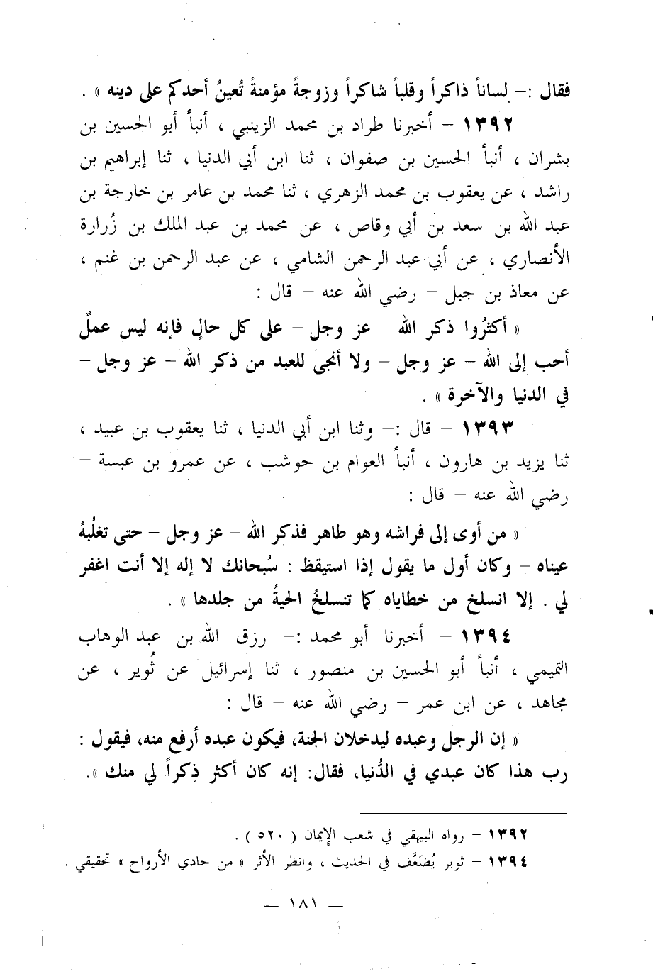 1392- أخبرنا طراد بن محمد الزينبي، أنبأ أبو الحسين بن بشران، أنبأ الحسين بن صفوان، ثنا ابن أبي الدنيا، ثنا إبراهيم بن راشد، عن يعقوب بن محمد الزهري، ثنا محمد بن عامر بن خارجة بن عبد الله بن سعد بن أبي وقاص، عن محمد بن عبد الملك بن زرارة الأنصاري، عن أبي عبد الرحمن الشامي، عن عبد الرحمن بن غنم، عن معاذ بن جبل –رضي الله عنه- قال: