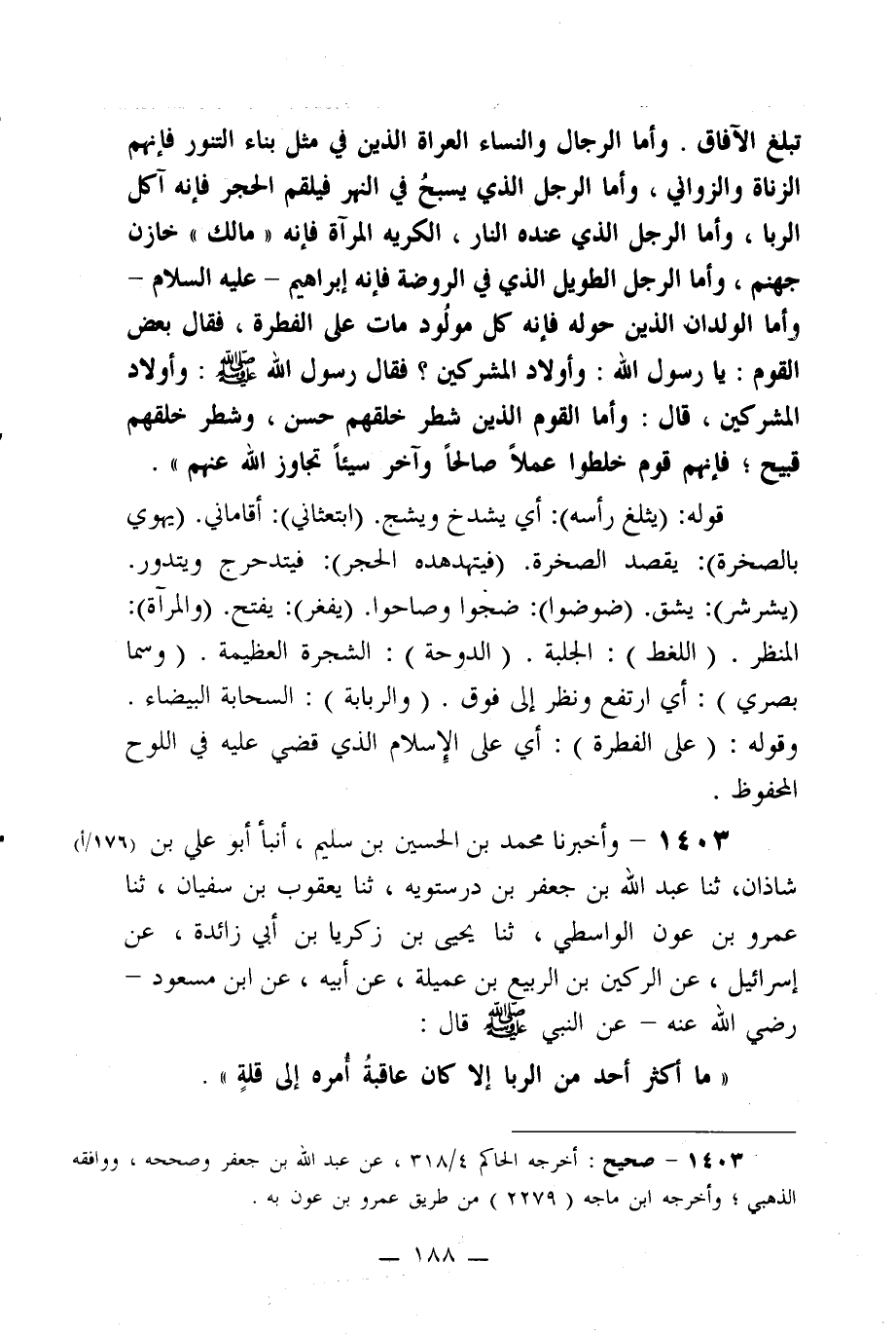 1403- وأخبرنا محمد بن الحسين بن سليم، أنبأ أبو علي بن شاذان، ثنا عبد الله بن جعفر بن درستويه، ثنا يعقوب بن سفيان، ثنا عمرو بن عون الواسطي، ثنا يحيى بن زكريا بن أبي زائدة، عن إسرائيل، عن الركين بن الربيع بن عميلة، عن أبيه، عن ابن مسعود –رضي الله عنه- عن النبي صلى الله عليه وسلم قال: