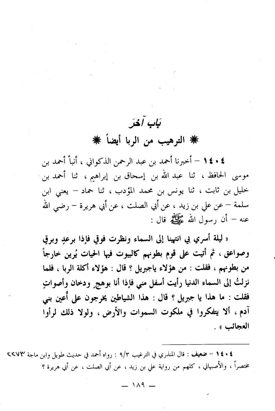 ((ليلة أسري بي انتهينا إلى السماء ونظرت فوقي فإذا برعدٍ وبرقٍ وصواعق، ثم أتيت على قوم بطونهم كالبيوت فيها الحيات يرين خارجاً من بطونهم، فقلت: من هؤلاء يا جبريل؟ قال: هؤلاء أكلة الربا، فلما نزلت إلى السماء الدنيا رأيت أسفل مني فإذا أنا بوهجٍ ودخان وأصواتٍ فقلت: ما هذا يا جبريل؟ قال: هذا الشياطين يخرجون على أعين بني آدم، ألا يتفكروا في ملكوت السموات والأرض، ولولا ذلك لرأوا العجائب)) .