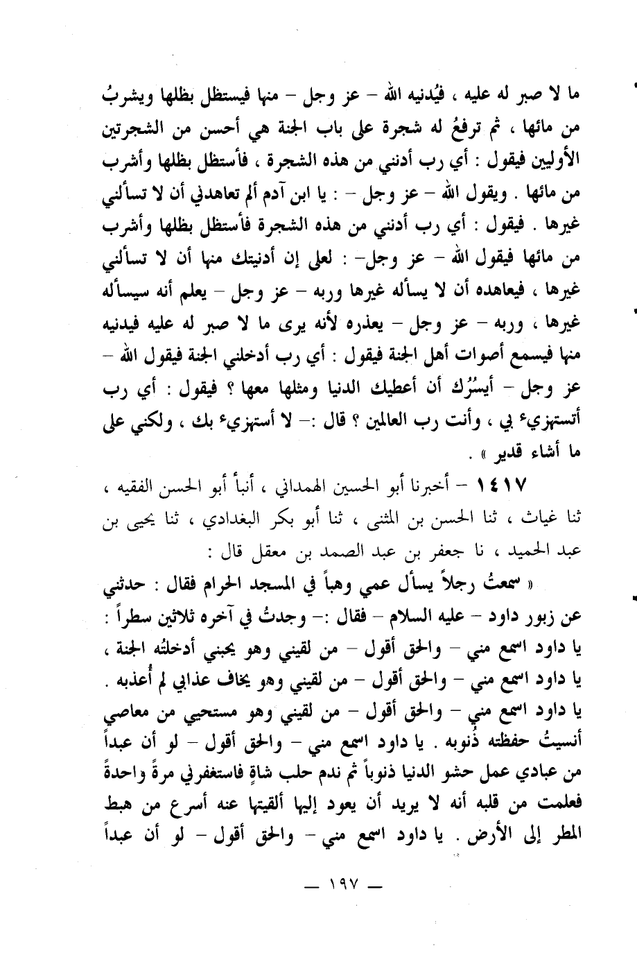 ((سمعت رجلاً يسأل عمي وهباً في المسجد الحرام فقال: حدثني عن زبور داود –عليه السلام- فقال: -وجدت في آخره ثلاثين سطراً: يا داود اسمع مني –والحق أقول- من لقيني وهو يحبني أدخلته الجنة، يا داود اسمع مني –والحق أقول- من لقيني وهو يخاف عذابي لم أعذبه. يا داود اسمع مني –والحق أقول- من لقيني وهو مستحيي من معاصي أنسيت حفظته ذنوبه. يا داود اسمع مني –والحق أقول- لو أن عبداً من عبادي عمل حشو الدنيا ذنوباً ثم ندم حلب شاةٍ فاستغفرني مرةً واحدةً فعلمت من قلبه أنه لا يريد أن يعود إليها ألقيتها عنه أسرع من هبط المطر إلى الأرض. يا داود اسمع مني –والحق أقول- لو أن عبداً -[198]- من عبادي أتاني بحسنةٍ واحدةٍ حكمته في جنتي. قال داود –عليه السلام-: إلهي من أجل ذلك لمن عرفك أن يقطع رجاءه منك. يا داود: إنما يكفي أوليائي السير من العمل كما يكفي الطعام من الملح. هل تدري يا داود متى أتولاهم؟ إذا طهروا قلوبهم من الشرك ونزعوا من قلوبهم الشك وعلموا أن لي جنةً وناراً وأنا أحيي وأميت وأبعث من في القبور، ولم أتخذ صاحبةً ولا ولداً، فإن توفيتهم بسير من العمل وهم يوقنون بذلك، جعلته عظيماً، هل تدري يا داود من أسرع الناس مراً على الصراط: الذين يرضون بحكمي وألسنتهم رطبة من ذكري. هل تدري يا داود أي المؤمنين أحب إلي؟ الذي إذا قال: لا إله إلا الله اقشعر جلده، إني أكره له الموت كما يكره الوالد لولده، ولا بد له منه، إني أريد أن أسره في دار سوى هذه، فإن نعيمها فيها بلاء، ورخاءها فيها شدة فيها عدو ولا يألونهم فيه خبالاً، من أجل ذلك عجلت أوليائي إلى الجنة لولا ذلك ما مات آدم وولده حتى ينفخ في الصور. يا داود ما تقول في نفسك؟ تقول: قطعت عليهم عبادتهم، أما تعلم ما أتيت عبدي المؤمن على عثرةٍ يعثرها فكيف إذا ذاق الموت، وهو من أعظم المصيبات، وهو بين أطباق التراب. إنما أحبه طول ما أحبه لأعظم له الأجر، وأجري عمله أحسن ما كان يعمل إلى يوم القيامة. يا داود من أجل ذلك سميت نفسي: أرحم الراحمين)) .