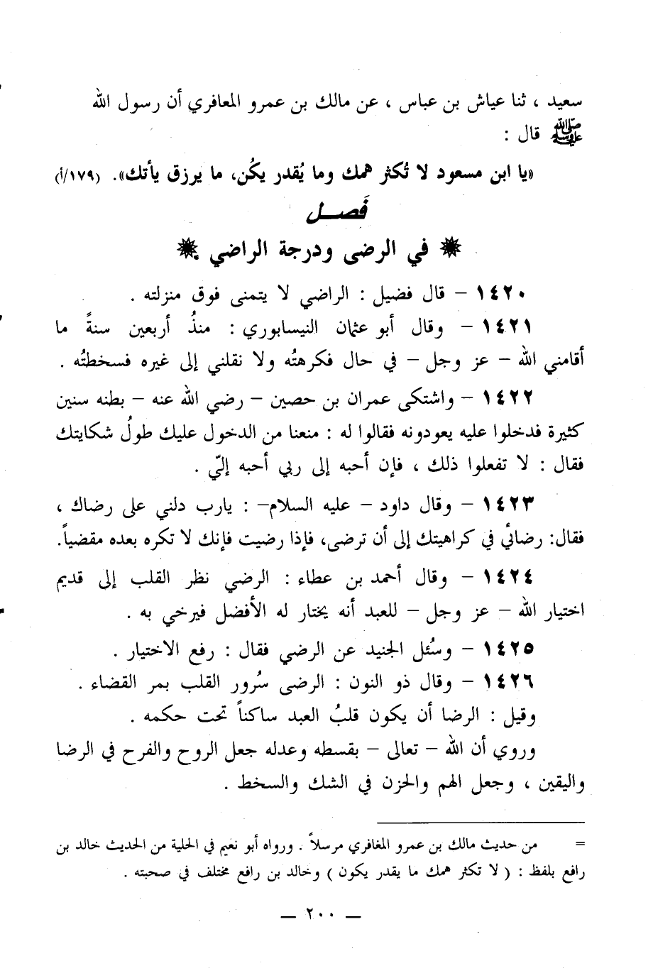 1420- قال فضيل: الراضي لا يتمنى فوق منزلته.