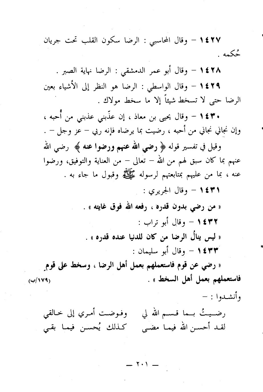 1429- وقال الواسطي: الرضا هو النظر إلى الأشياء بعين الرضا حتى لا تسخط شيئاً إلا ما سخط مولاك.