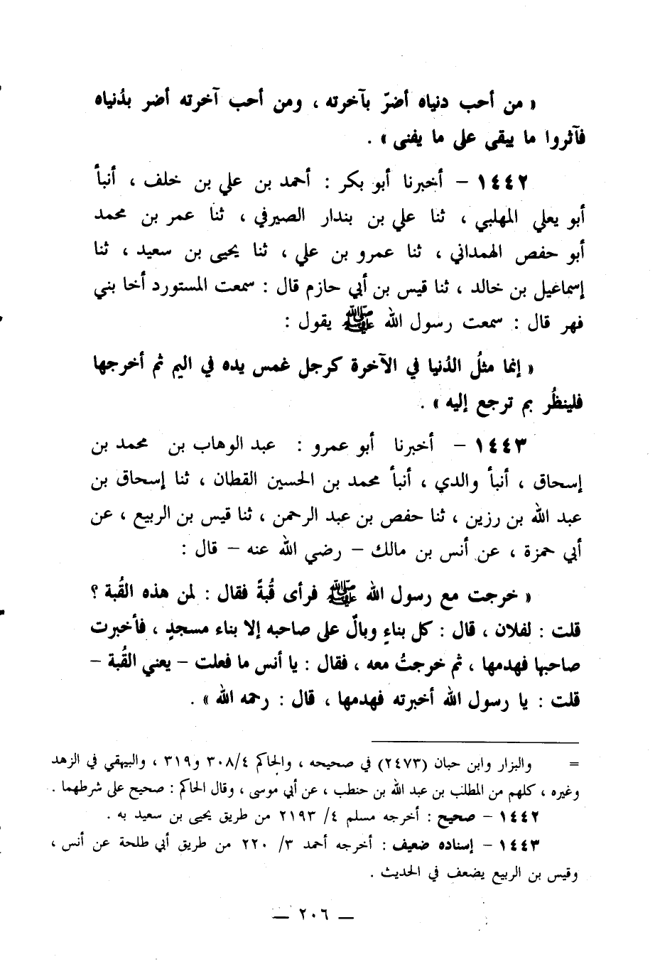 1443- أخبرنا أبو عمرو: عبد الوهاب بن محمد بن إسحاق، أنبأ والدي، أنبأ محمد بن الحسين القطان، ثنا إسحاق بن عبد الله بن رزين، ثنا حفص بن عبد الرحمن، ثنا قيس بن الربيع، عن أبي حمزة، عن أنس بن مالك –رضي الله عنه- قال: