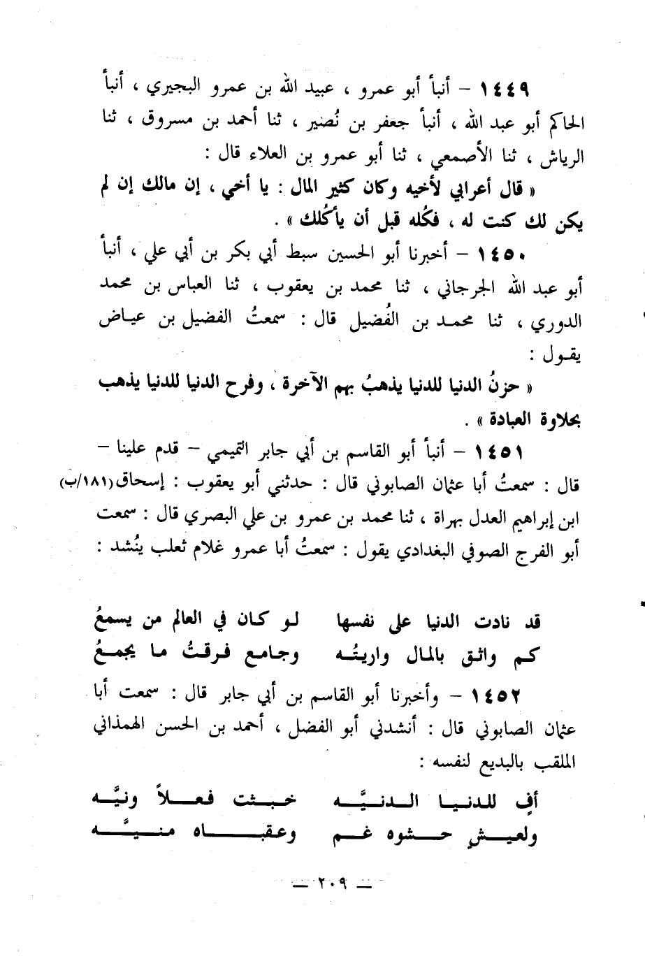 1451- أنبأ أبو القاسم بن أبي جابر التميمي –قدم علينا- قال: سمعت أبا عثمان الصابوني قال: حدثني أبو يعقوب: إسحاق بن إبراهيم العدل بهراة، ثنا محمد بن عمرو بن علي البصري قال: سمعت أبو الفرج الصوفي البغدادي يقول: سمعت أبا عمرو غلام ثعلب ينشد: