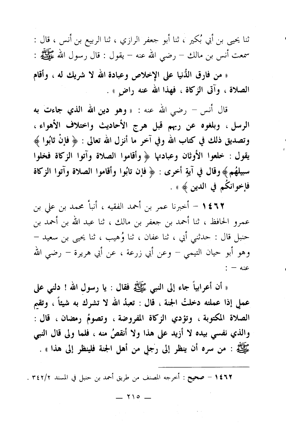 1462- أخبرنا عمر بن أحمد الفقيه، أنبأ محمد بن علي بن عمرو الحافظ، ثنا أحمد بن جعفر بن مالك، ثنا عبد الله بن أحمد بن حنبل قال: حدثني أبي، ثنا عفان، ثنا وهيب، ثنا يحيى بن سعيد –وهو أبو حيان التيمي- وعن أبي زرعة، عن أبي هريرة –رضي الله عنه-: