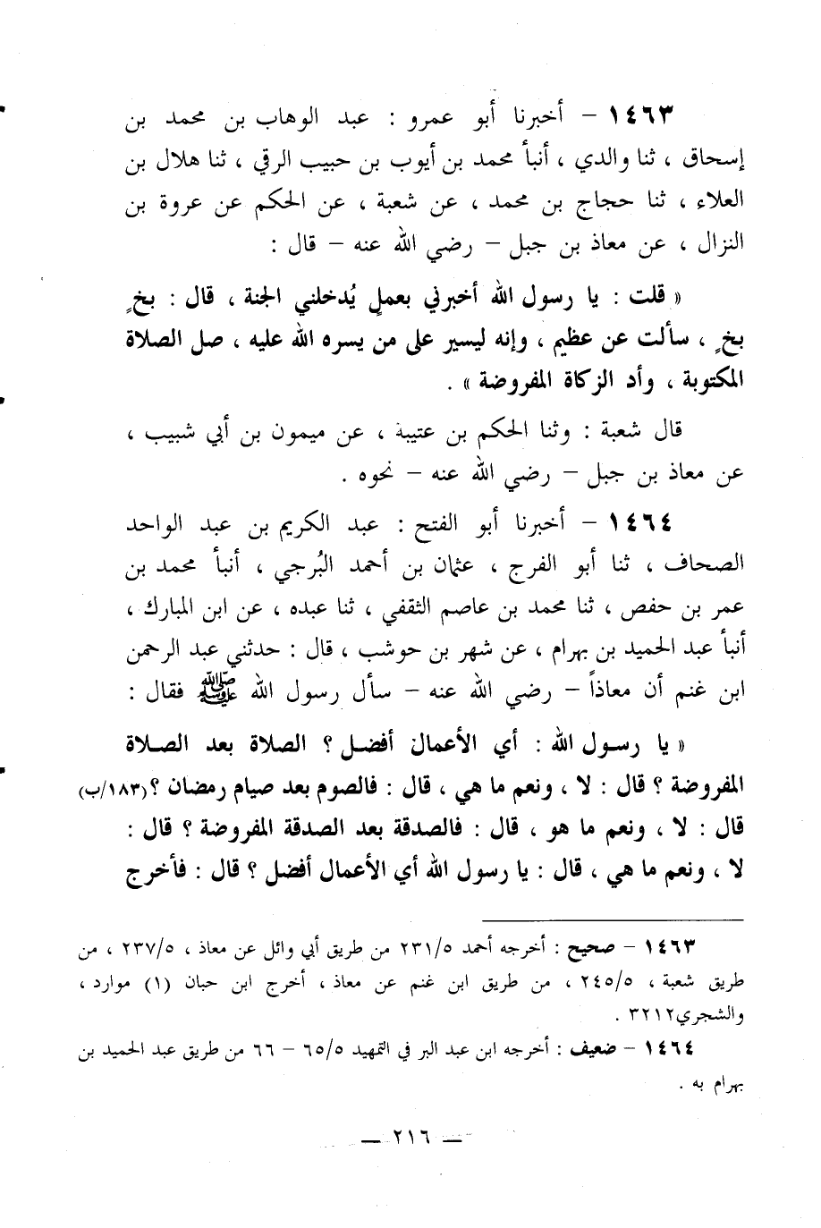 1464- أخبرنا أبو الفتح: عبد الكريم بن عبد الواحد الصحاف، ثنا أبو الفرج، عثمان بن أحمد البرجي، أنبأ محمد بن عمر بن حفص، ثنا محمد بن عاصم الثقفي، ثنا عبده، عن ابن المبارك، أنبأ عبد الحميد بن بهرام، عن شهر بن حوشب، قال: حدثني عبد الرحمن بن غنم أن معاذاً –رضي الله عنه- سأل رسول الله صلى الله عليه وسلم فقال: