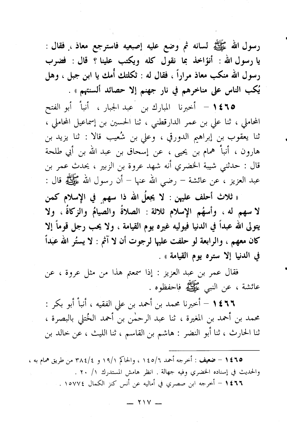 1465- أخبرنا المبارك بن عبد الجبار، أنبأ أبو الفتح المحاملي، ثنا علي بن عمر الدارقطني، ثنا الحسين بن إسماعيل المحاملي، ثنا يعقوب بن إبراهيم الدورقي، وعلي بن شعيب قالا: ثنا يزيد بن هارون، أنبأ همام بن يحيى، عن إسحاق بن عبد الله بن أبي طلحة قال: حدثني شيبة الخضري أنه شهد عروة بن الزبير، يحدث عمر بن عبد العزيز، عن عائشة –رضي الله عنها- أن رسول الله صلى الله عليه وسلم قال: