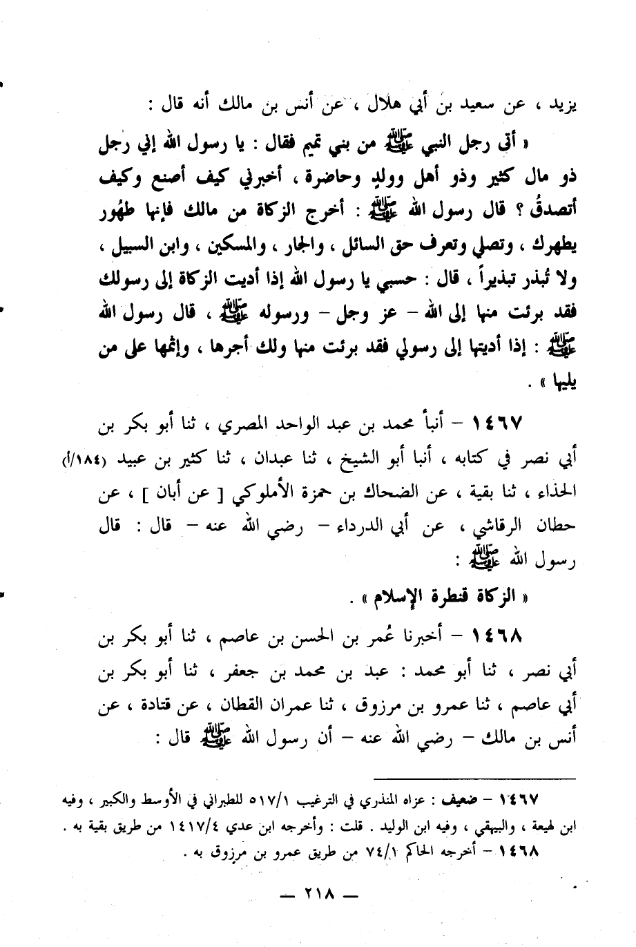 1467- أنبأ محمد بن عبد الواحد المصري، ثنا أبو بكر بن أبي نصر في كتابه، أنبأ أبو الشيخ، ثنا عبدان، ثنا كثير بن عبيد الحذاء، ثنا بقية، عن الضحاك بن حمزة الأملوكي [عن أبان] ، عن حطان الرقاشي، عن أبي الدرداء –رضي الله عنه- قال: قال رسول الله صلى الله عليه وسلم: