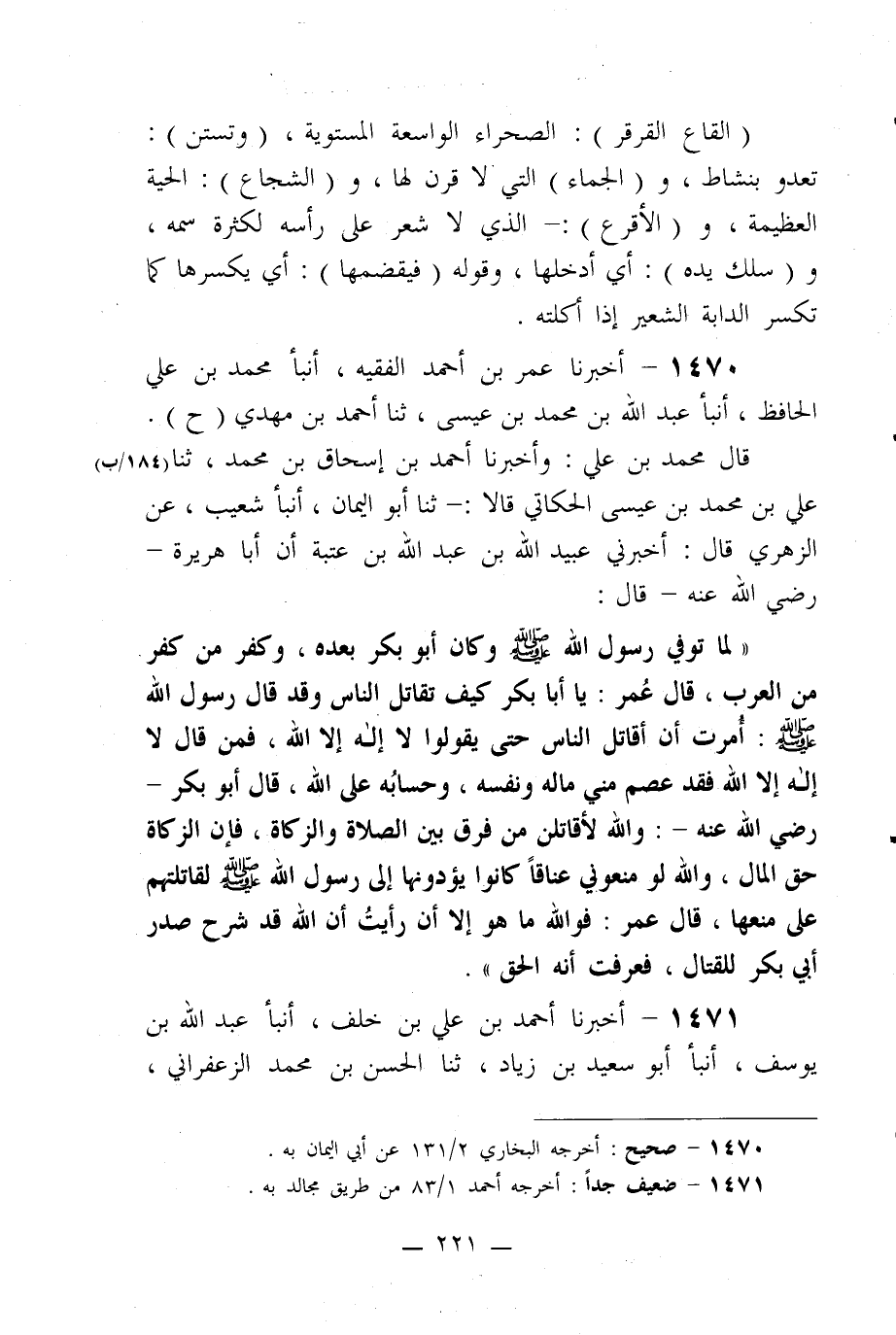 1471- أخبرنا أحمد بن علي بن خلف، أنبأ عبد الله بن يوسف، أنبأ أبو سعيد بن زياد، ثنا الحسن بن محمد الزعفراني، -[222]- ثنا عبد الواحد بن زياد، ثنا مجالد، عن الشعبي، عن الحارث، عن علي –رضي الله عنه- قال: