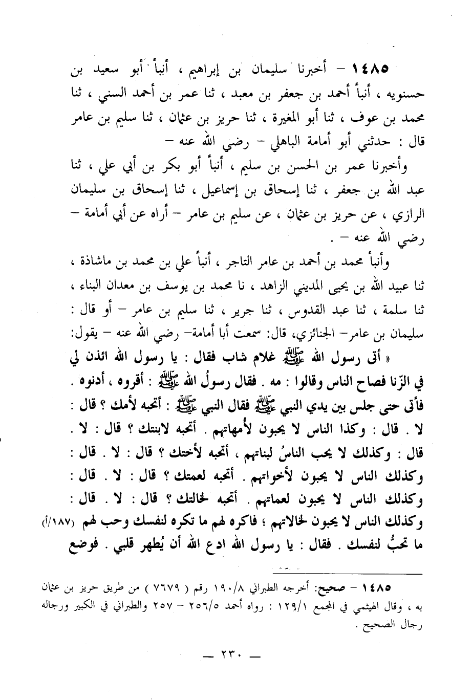 1485- أخبرنا سليمان بن إبراهيم، أنبأ أبو سعيد بن حسنويه، أنبأ أحمد بن جعفر بن معبد، ثنا عمر بن أحمد السني، ثنا محمد بن عوف، ثنا أبو المغيرة، ثنا حريز بن عثمان، ثنا سليم بن عامر قال: حدثني أبو أمامة الباهلي –رضي الله عنه-.