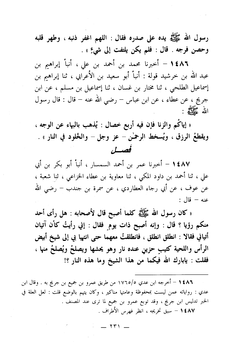 1486- أخبرنا محمد بن أحمد بن علي، أنبأ إبراهيم بن عبد الله بن خرشيذ قولة: أنبأ أبو سعيد بن الأعرابي، ثنا إبراهيم بن إسماعيل الطلحي، ثنا مختار بن غسان، ثنا إسماعيل بن مسلم، عن ابن جريج، عن عطاء، عن ابن عباس –رضي الله عنه- قال: قال رسول الله صلى الله عليه وسلم: