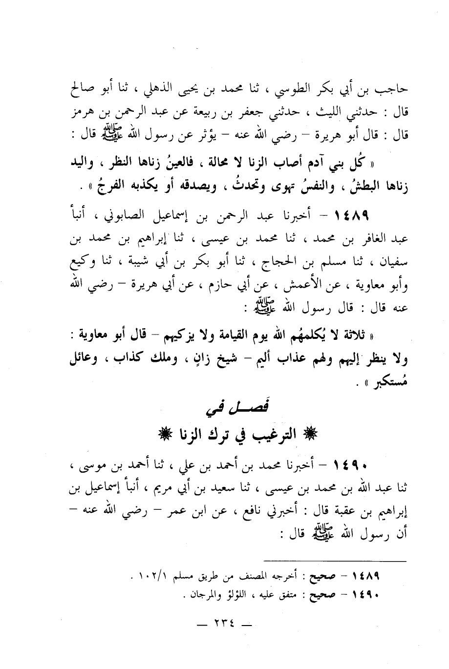 1489- أخبرنا عبد الرحمن بن إسماعيل الصابوني، أنبأ عبد الغافر بن محمد، ثنا محمد بن عيسى، ثنا إبراهيم بن محمد بن سفيان، ثنا مسلم بن الحجاج، ثنا أبو بكر بن أبي شيبة، ثنا وكيع وأبو معاوية، عن الأعمش، عن أبي حازم، عن أبي هريرة –رضي الله عنه- قال: قال رسول الله صلى الله عليه وسلم: