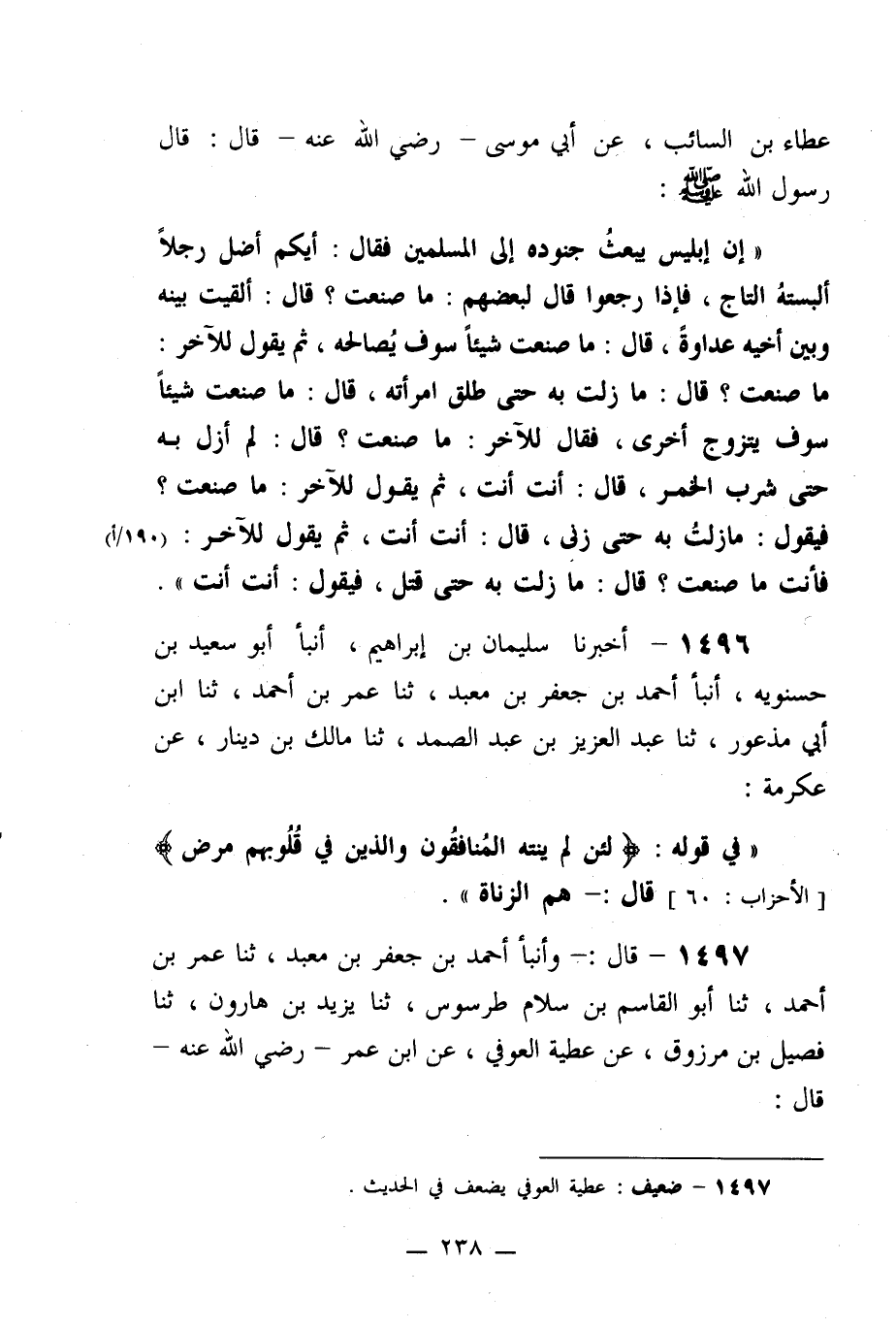 1497- قال: وأنبأ أحمد بن جعفر بن معبد، ثنا عمر بن أحمد، ثنا أبو القاسم بن سلام طرسوس، ثنا يزيد بن هارون، ثنا فصيل بن مرزوق، عن عطية العوفي، عن ابن عمر –رضي الله عنه- قال: