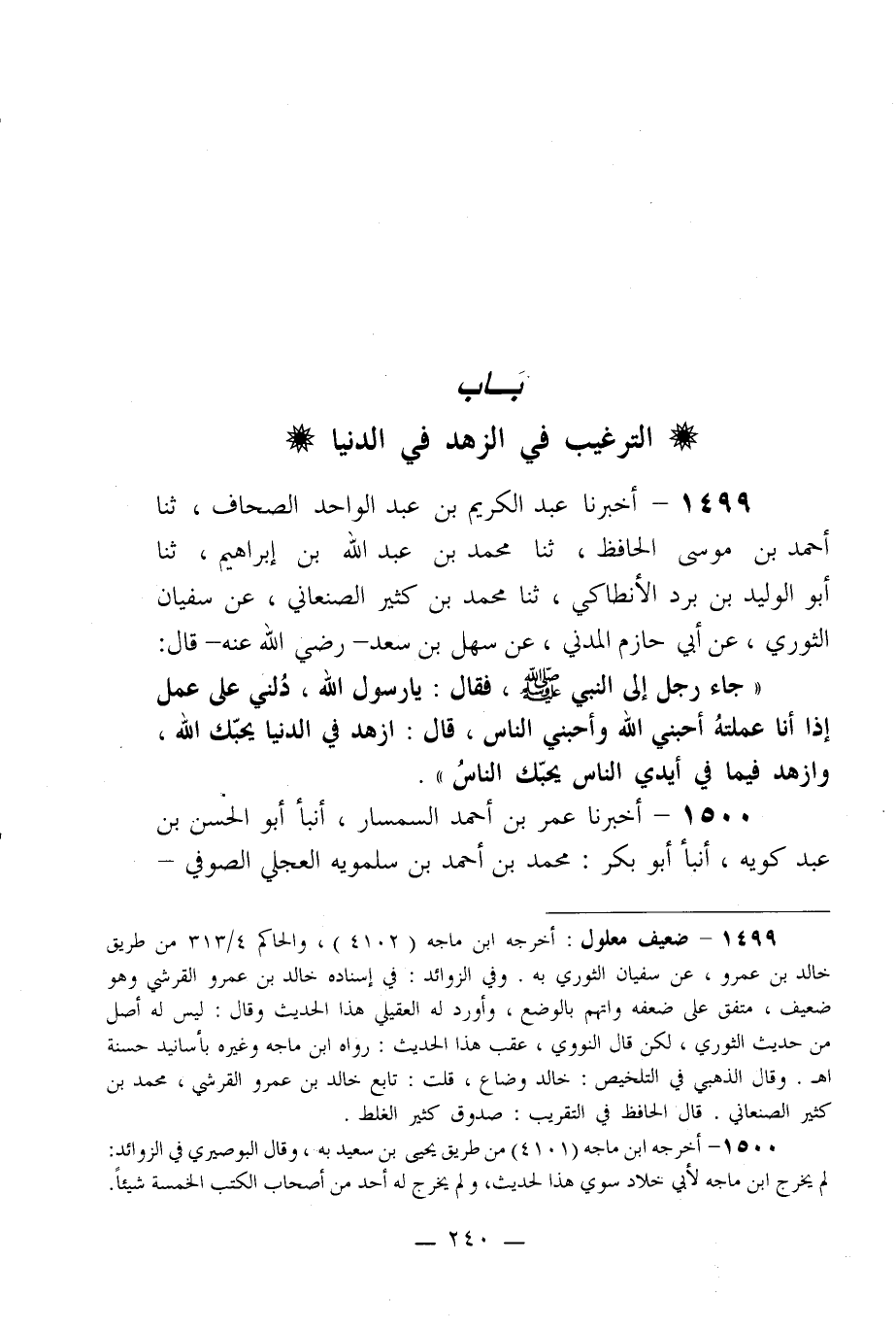 1499- أخبرنا عبد الكريم بن عبد الواحد الصحاف، ثنا أحمد بن موسى الحافظ، ثنا محمد بن عبد الله بن إبراهيم، ثنا أبو الوليد بن برد الأنطاكي، ثنا محمد بن كثير الصنعاني، عن سفيان الثوري، عن أبي حازم المدني، عن سهل بن سعد –رضي الله عنه- قال: