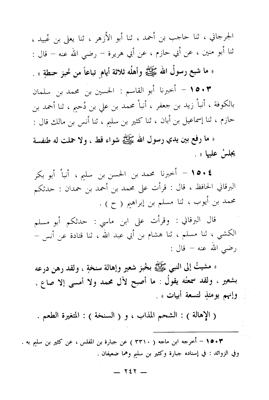 1503- أخبرنا أبو القاسم: الحسين بن محمد بن سلمان بالكوفة، أنبأ زيد بن جعفر، أنبأ محمد بن علي بن دحيم، ثنا أحمد بن حازم، ثنا إسماعيل بن أبان، ثنا كثير بن سليم، ثنا أنس بن مالك قال: