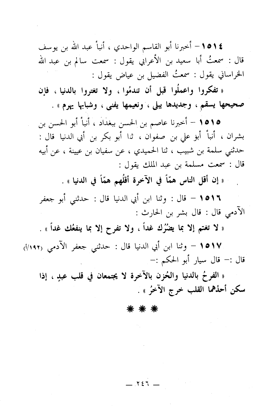 1516- قال: وثنا ابن أبي الدنيا قال: حدثني أبو جعفر الآدمي قال: قال بشر بن الحارث: