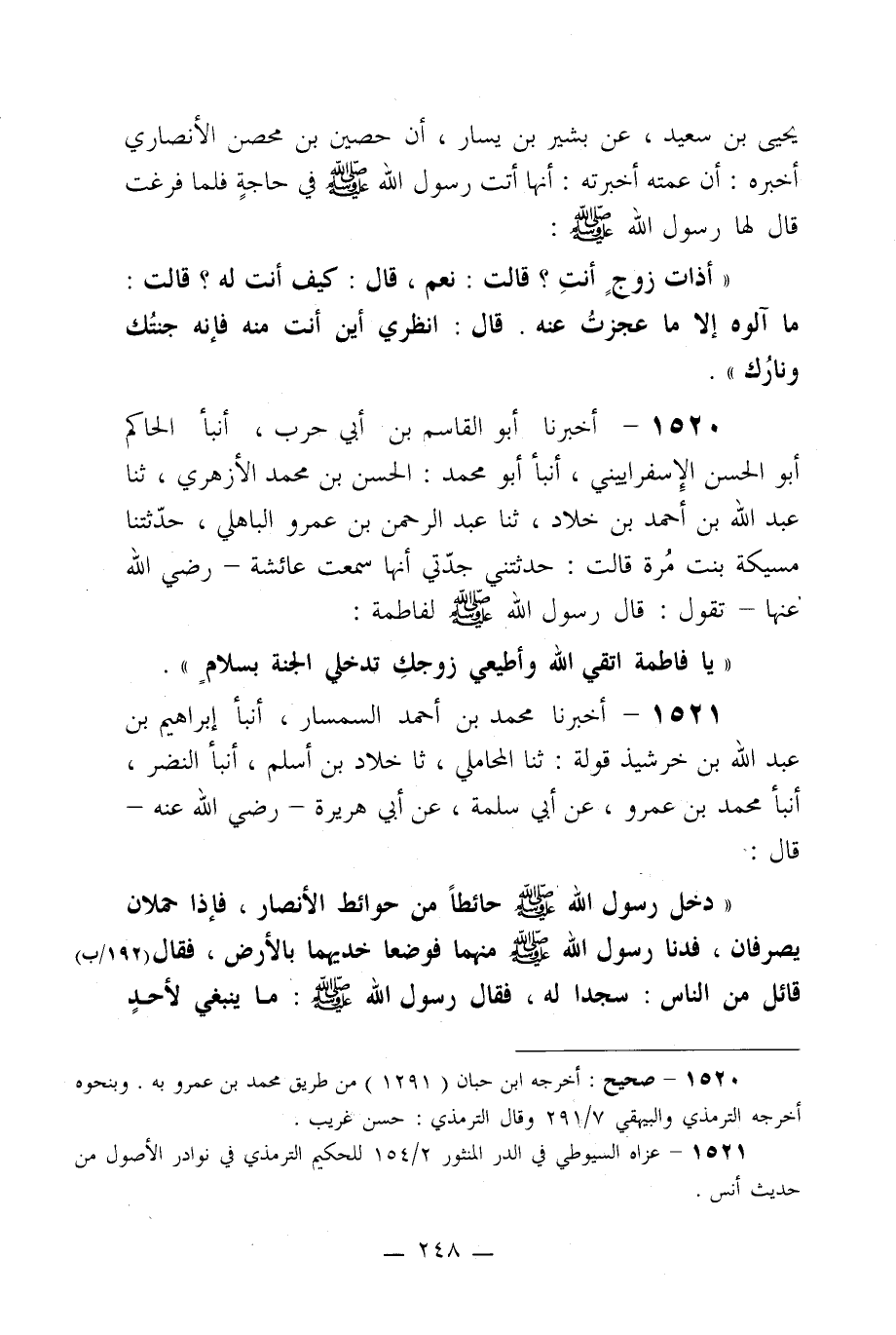1520- أخبرنا أبو القاسم بن أبي حرب، أنبأ الحاكم أبو الحسن الإسفراييني، أنبأ أبو محمد: الحسن بن محمد الأزهري، ثنا عبد الله بن أحمد بن خلاد، ثنا عبد الرحمن بن عمرو الباهلي، حدثتنا مسيكة بنت مرة قالت: حدثتني جدتي أنها سمعت عائشة –رضي الله عنها- تقول: قال رسول الله صلى الله عليه وسلم لفاطمة: