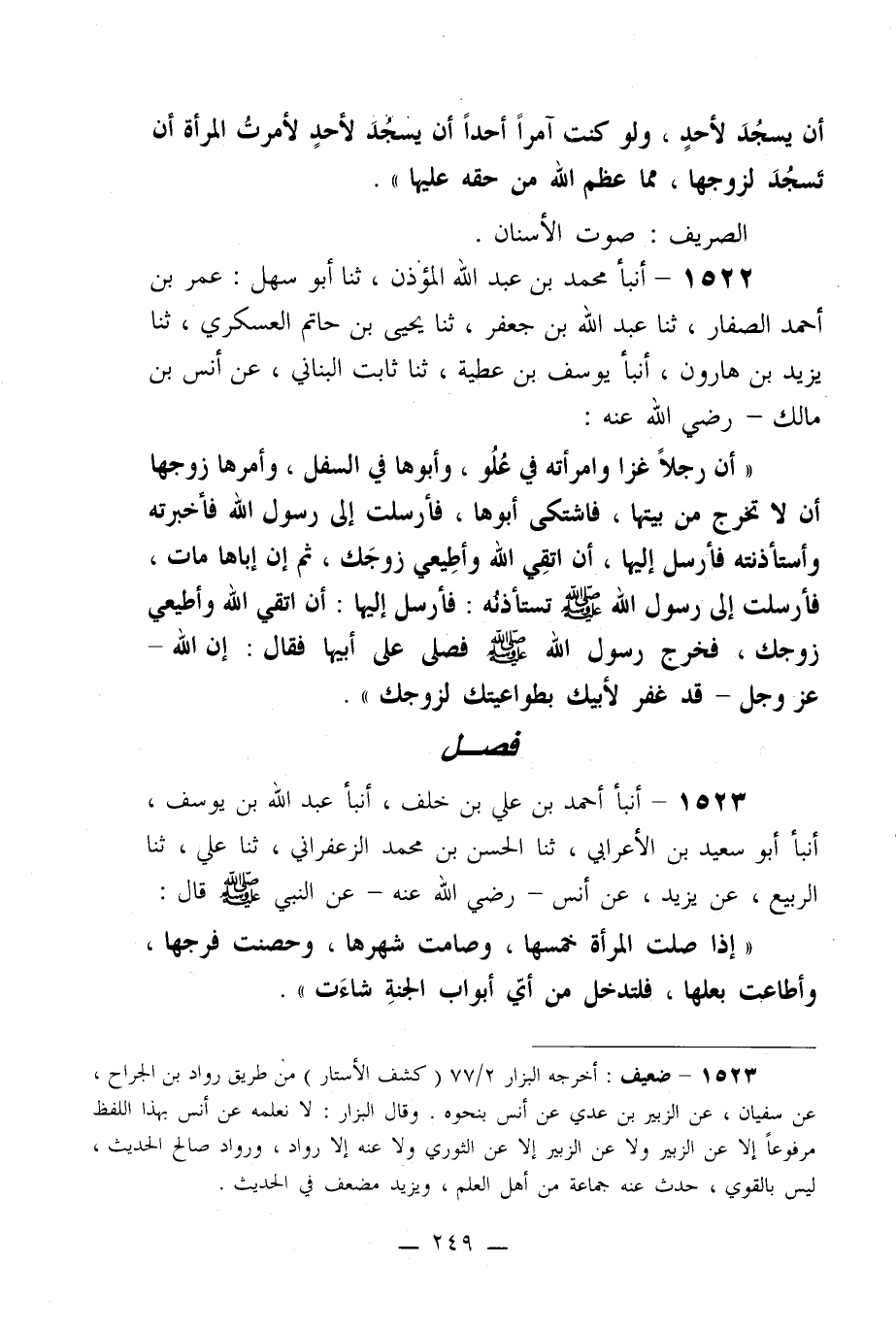 1522- أنبأ محمد بن عبد الله المؤذن، ثنا أبو سهل: عمر بن أحمد الصفار، ثنا عبد الله بن جعفر، ثنا يحيى بن حاتم العسكري، ثنا يزيد بن هارون، أنبأ يوسف بن عطية، ثنا ثابت البناني، عن أنس بن مالك –رضي الله عنه-: