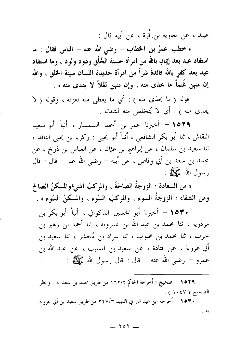1530- أخبرنا أبو الحسين الذكواني، أنبأ أبو بكر بن مردويه، ثنا محمد بن عبد الله بن عمرويه، ثنا أحمد بن زهير بن حرب، ثنا محمد بن محبوب، ثنا سراد بن مجشر، ثنا سعيد بن أبي عروبة، عن قتادة، عن سعيد بن المسيب، عن عبد الله بن عمرو –رضي الله عنه- قال: قال رسول الله صلى الله عليه وسلم: