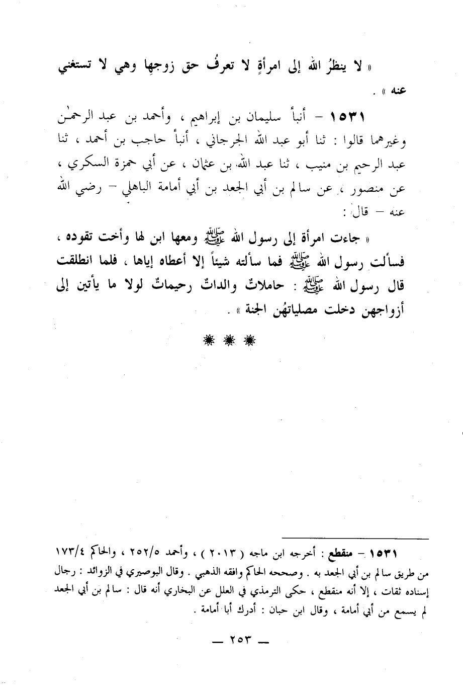 1531- أنبأ سليمان بن إبراهيم، وأحمد بن عبد الرحمن وغيرهما قالوا: ثنا أبو عبد الله الجرجاني، أنبأ حاجب بن أحمد، ثنا عبد الرحيم بن منيب، ثنا عبد الله بن عثمان، عن أبي حمزة السكري، عن منصور، عن سالم بن أبي الجعد بن أبي أمامة الباهلي –رضي الله عنه- قال: