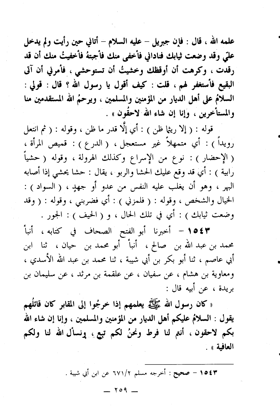 ((كان رسول الله صلى الله عليه وسلم يعلمهم إذا خرجوا إلى المقابر كان قائلهم يقول: السلام عليكم أهل الديار من المؤمنين والمسلمين، وإنا إن شاء الله بكم لاحقون، أنتم لنا فرط ونحن لكم تبع، ونسأل الله لنا ولكم العافية)) . -[260]- وقوله: (إن شاء الله) : ولم يقع الاستثناء على الموت وإنما وقع الاستثناء على قرب اللحوق بهم، و (الفرط) : المتقدمون، وفي رواية: أنتم لنا سلف.