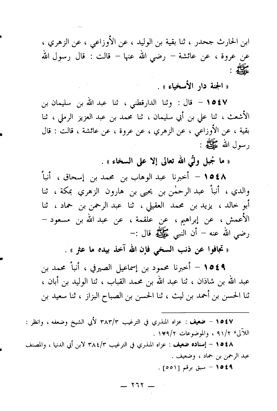 1548- أخبرنا عبد الوهاب بن محمد بن إسحاق، أنبأ والدي، أنبأ عبد الرحمن بن يحيى بن هارون الزهري بمكة، ثنا أبو خالد، يزيد بن محمد العقيلي، ثنا عبد الرحمن بن حماد، ثنا الأعمش، عن إبراهيم، عن علقمة، عن عبد الله بن مسعود –رضي الله عنه- أن النبي صلى الله عليه وسلم قال: