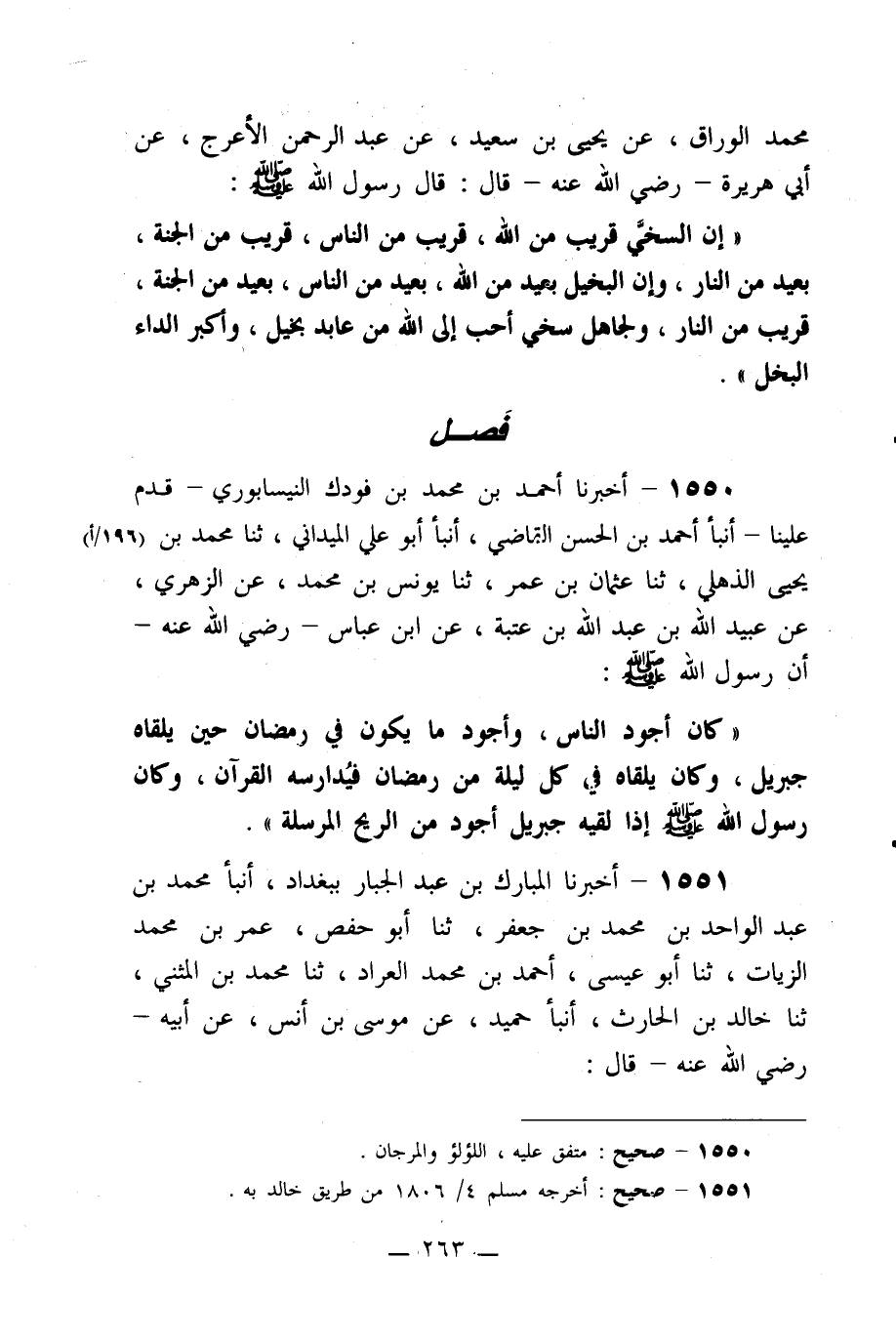 1550- أخبرنا أحمد بن محمد بن فودك النيسابوري –قدم علينا- أنبأ أحمد بن الحسن القاضي، أنبأ أبو علي الميداني، ثنا محمد بن يحيى الذهلي، ثنا عثمان بن عمر، ثنا يونس بن محمد، عن الزهري، عن عبيد الله بن عبد الله بن عتبة، عن ابن عباس –رضي الله عنه- أن رسول الله صلى الله عليه وسلم: