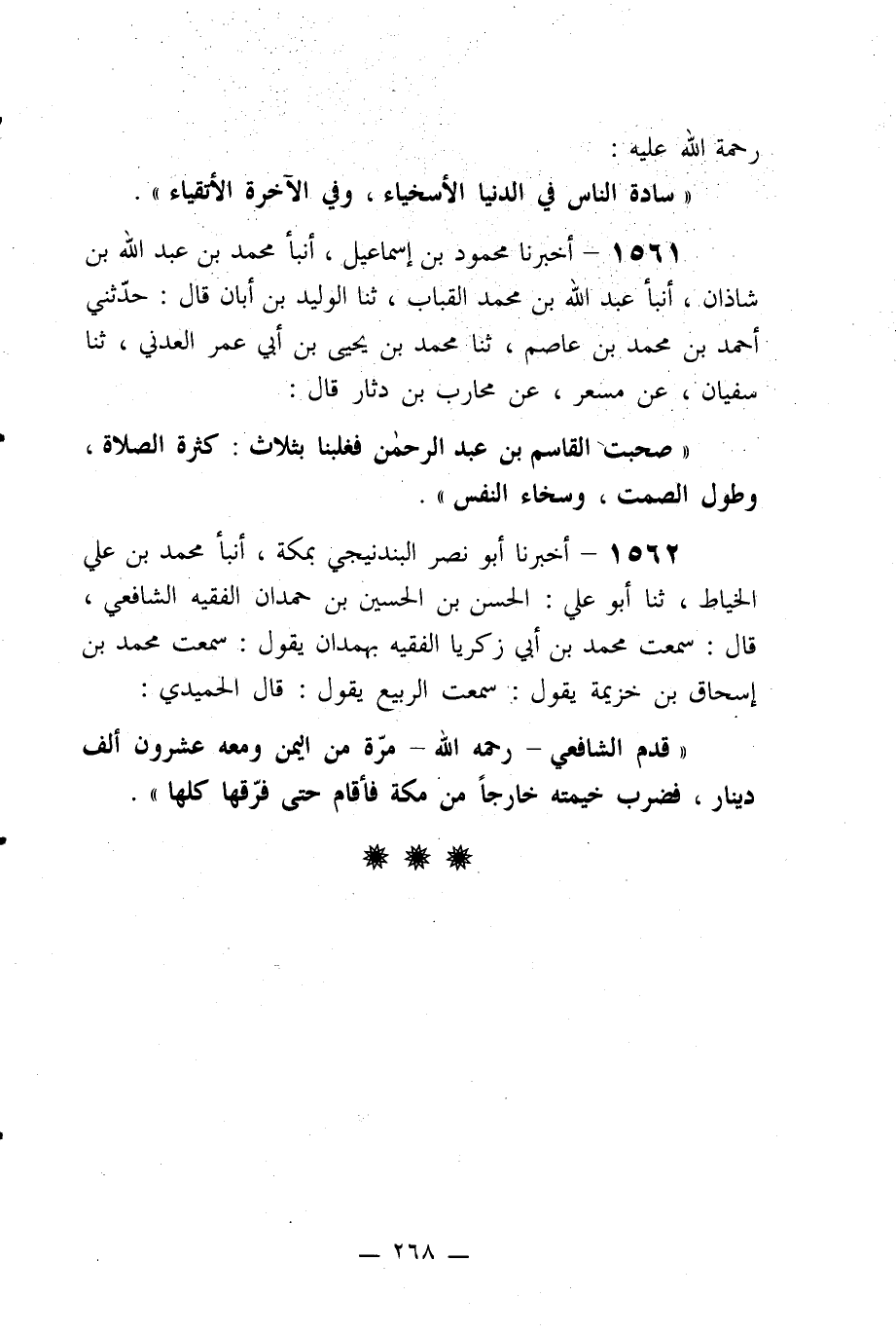 1562- أخبرنا أبو نصر البندنيجي بمكة، أنبأ محمد بن علي الخياط، ثنا أبو علي: الحسن بن الحسين بن حمدان الفقيه الشافعي، قال: سمعت محمد بن أبي زكريا الفقيه بهمدان يقول: سمعت محمد بن إسحاق بن خزيمة يقول: سمعت الربيع يقول: قال الحميدي: